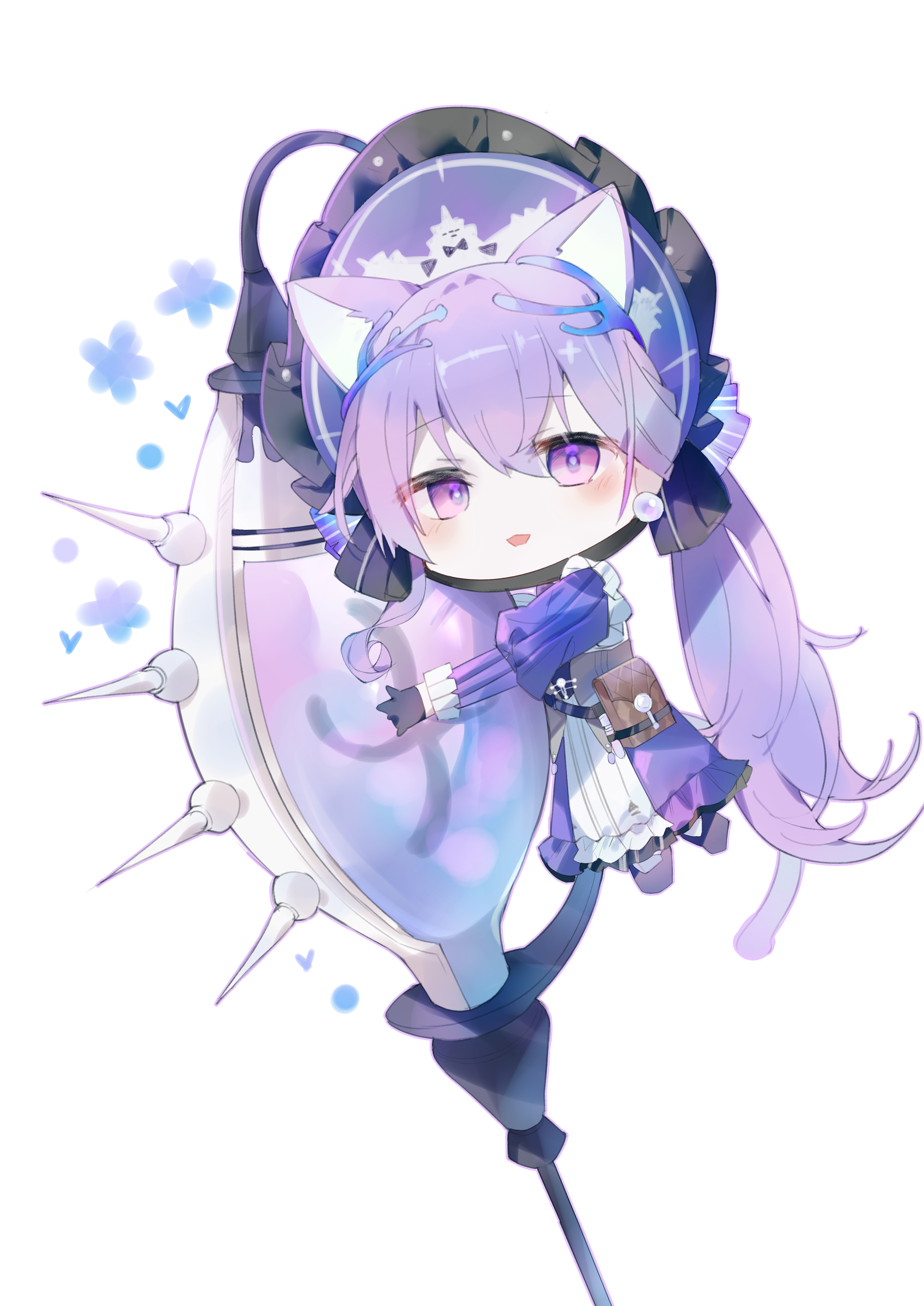 1girl absurdres animal_ears bag black_gloves bonnet brown_bag cat_day cat_ears chibi chibi_only commentary dress earrings english_commentary gloves hair_ornament highres holding jewelry kemonomimi_mode light_blush long_hair long_sleeves looking_at_viewer purple_bonnet purple_dress purple_eyes purple_hair rosemary_(wuthering_waves) shigureszku shoulder_bag simple_background smile solo very_long_hair white_background wuthering_waves