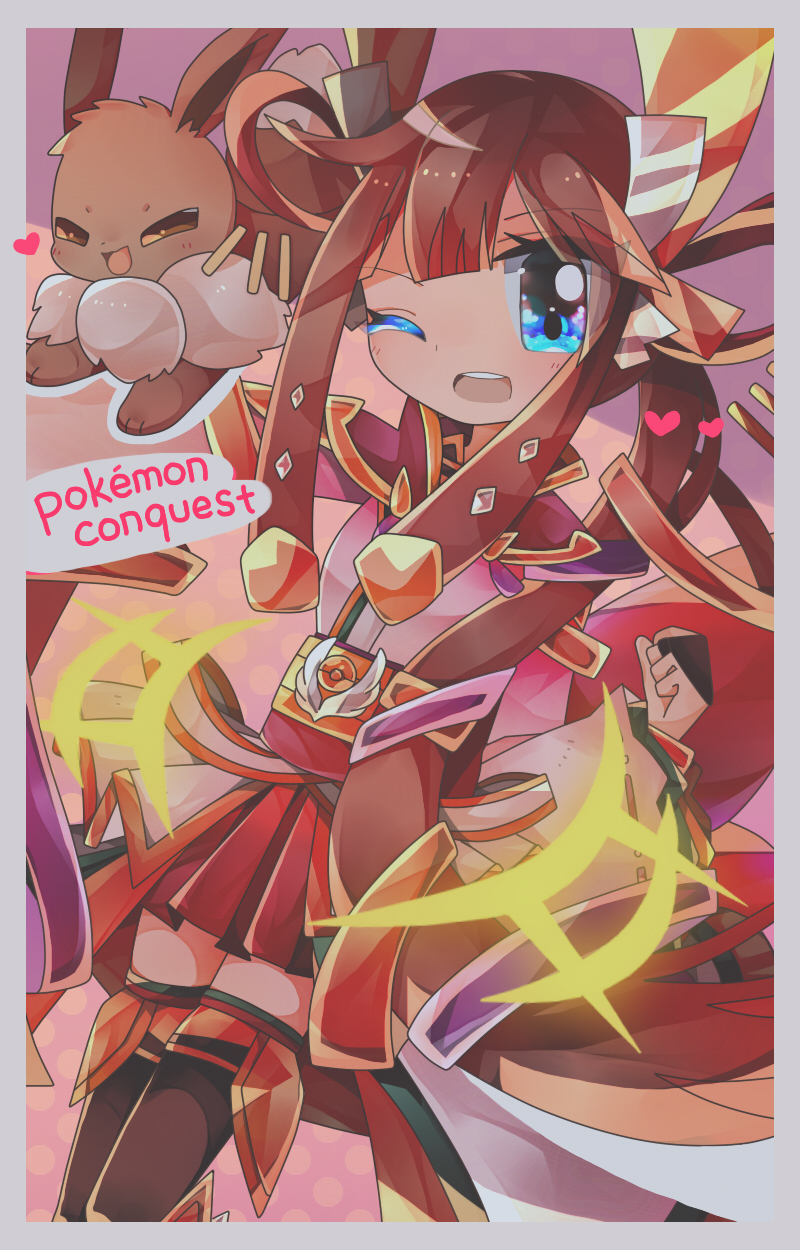 armor blue_eyes brown_hair eevee english_text gen_1_pokemon hair_ornament headdress heart heroine_(pokemon_conquest) highres japanese_clothes kimono long_hair nintendo obi one_eye_closed pleated_skirt pokemon pokemon_conquest ponytail sash sengoku_musou skirt smile thighhighs wink