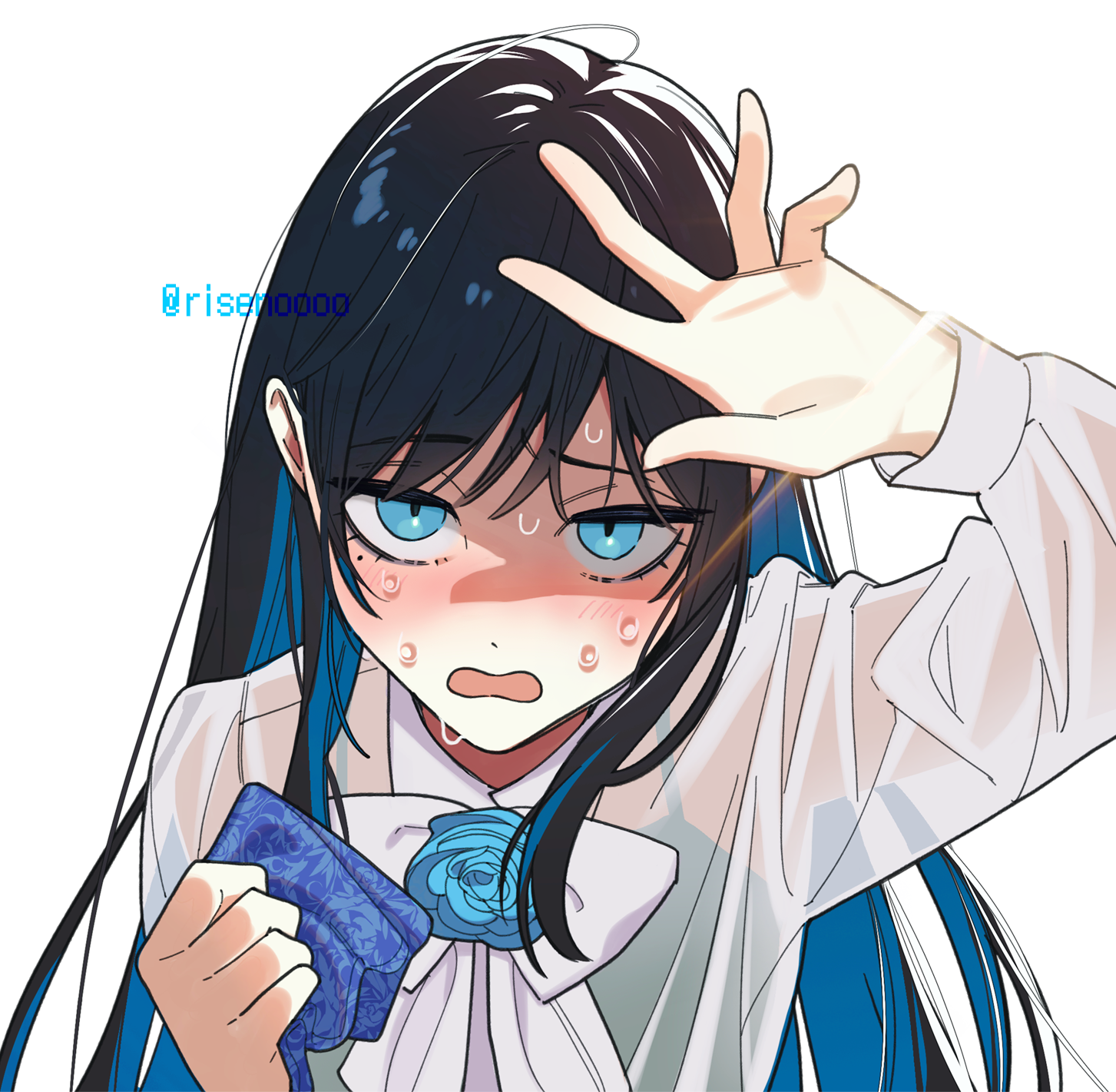 1girl ado_(utaite) artist_name blue_eyes blue_flower blue_hair blue_rose blush chando_(ado) commentary covering_face flower highres long_hair mole mole_under_eye riseno rose see-through_clothes see-through_shirt shirt sunlight sweat utaite wet wet_clothes white_background