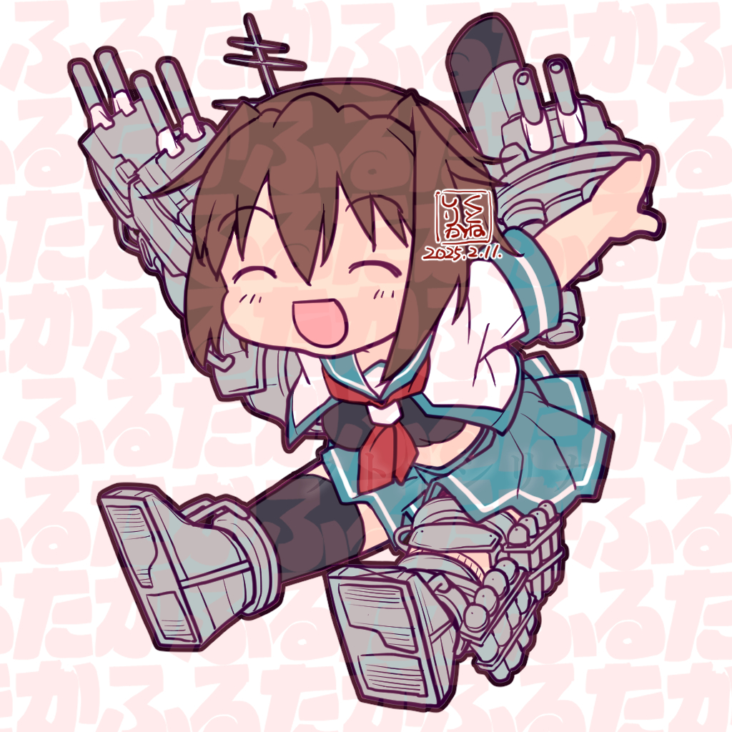 1girl adapted_costume artist_logo black_thighhighs blue_sailor_collar brown_hair chibi closed_eyes dated full_body furutaka_(kancolle) kantai_collection kutone_shirika logo neckerchief red_neckerchief rigging sailor_collar school_uniform serafuku short_hair single_thighhigh smile smokestack solo thighhighs too_many_watermarks wall_of_text watermark