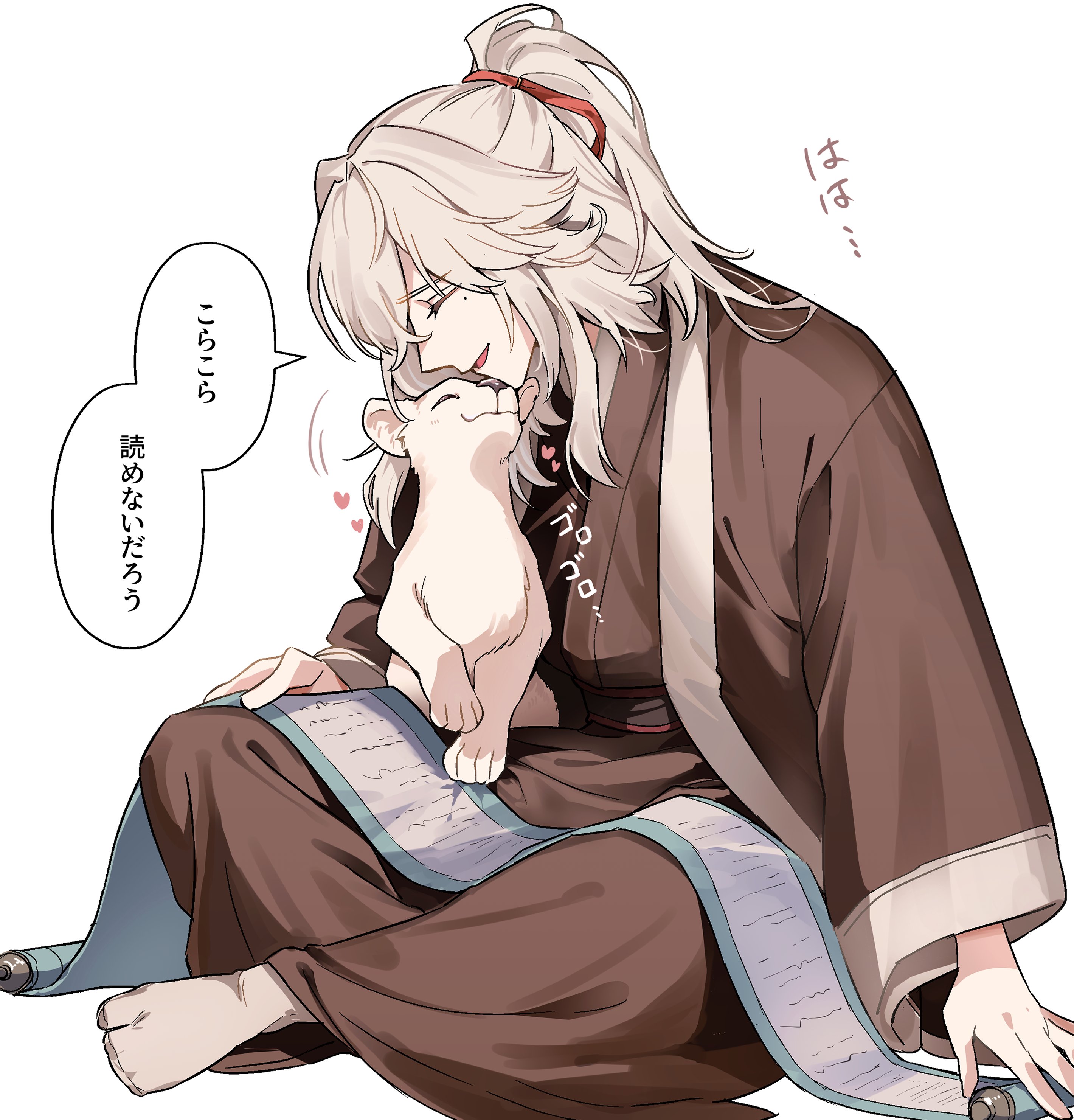 1boy absurdres animal animal_on_lap arm_support brown_pajamas cat closed_eyes dashi_(minzoku_gb) full_body grey_hair hair_ribbon heart highres honkai:_star_rail honkai_(series) jing_yuan long_hair long_sleeves male_focus mole mole_under_eye on_lap open_mouth pajamas red_ribbon ribbon scroll sidelocks simple_background smile socks solo translation_request white_background