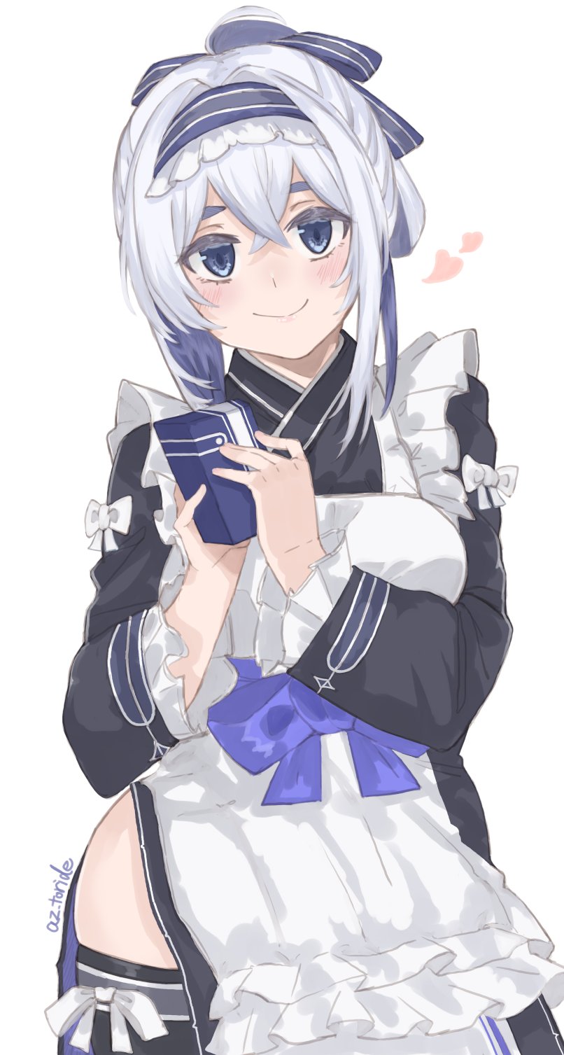 1girl apron azumaya_toride black_kimono black_thighhighs blue_eyes blue_ribbon box cowboy_shot hair_ribbon highres japanese_clothes kamoi_(kancolle) kamoi_(valentine)_(kancolle) kantai_collection kimono long_hair looking_at_viewer official_alternate_costume ribbon simple_background solo thighhighs white_apron white_background white_hair