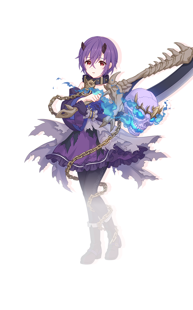 1girl animal_collar bare_shoulders black_horns black_pantyhose chain collar crossed_bangs demon_girl demon_horns detached_sleeves dress drop_shadow elbow_gloves father_and_child father_and_daughter floating frilled_dress frills full_body gloves hair_between_eyes holding holding_weapon horns looking_at_viewer mole mole_under_eye official_art pantyhose parent_and_child princess_connect! purple_dress purple_gloves purple_hair purple_sleeves red_eyes shinobu_(princess_connect!) short_hair simple_background single_detached_sleeve single_elbow_glove skull skullfather_(princess_connect!) sleeveless sleeveless_dress solo standing tachi-e torn_clothes torn_dress transparent_background weapon