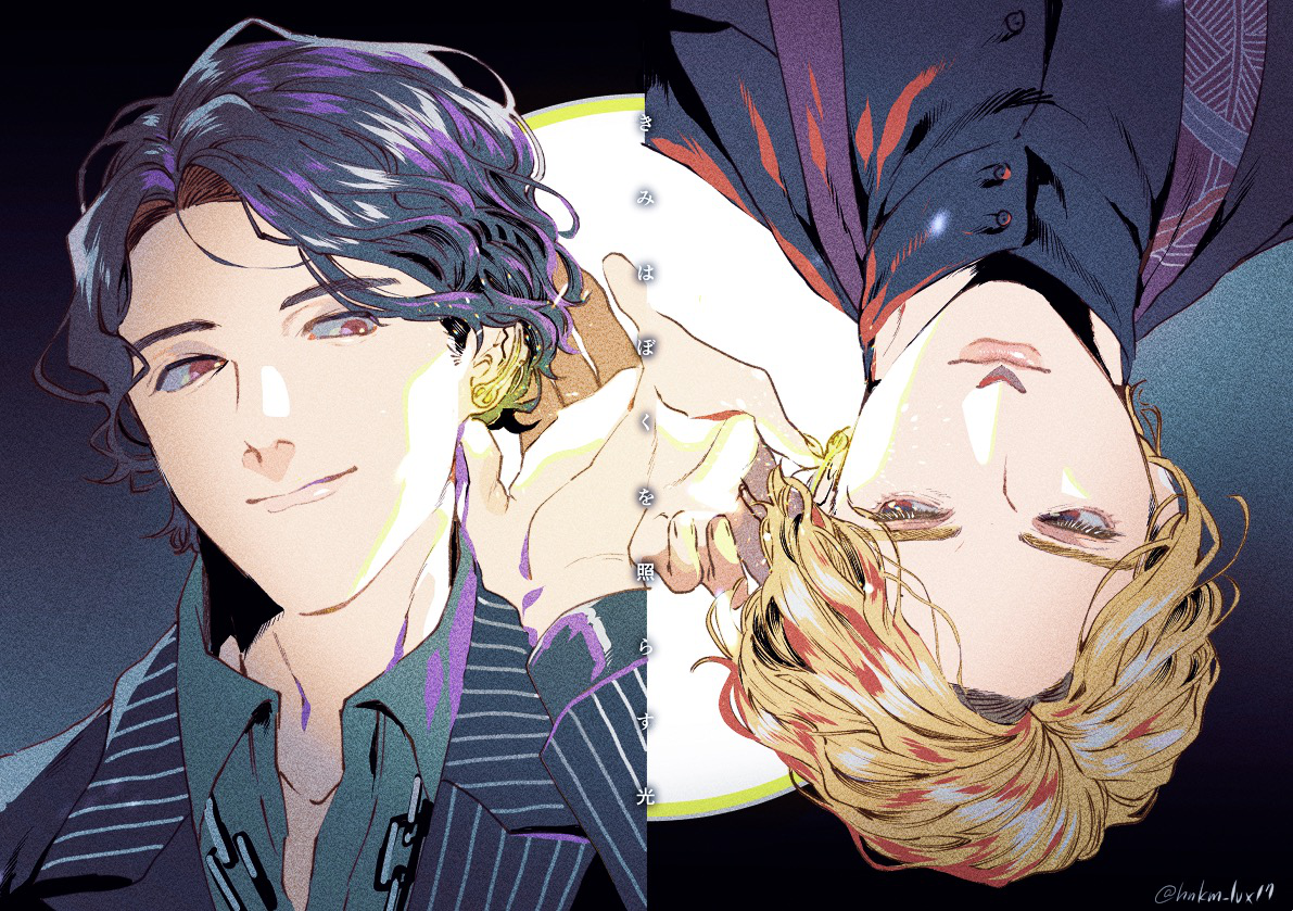 2boys black_background black_hair black_haori black_shirt black_suit blonde_hair chain closed_mouth collared_shirt earrings formal_clothes glowing grey_shirt hand_on_own_ear haori hinoe_(right-hnxx03) horobi_(kamen_rider_01) japanese_clothes jewelry jin_(kamen_rider_01) kamen_rider kamen_rider_01_(series) male_focus multiple_boys red_eyes shirt short_hair single_earring smile suit upside-down wavy_hair