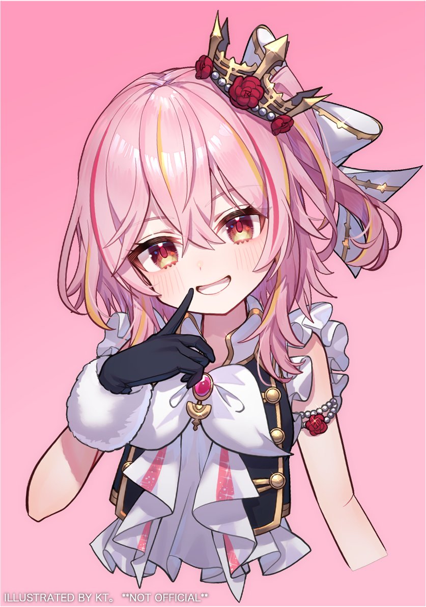 1girl black_gloves blush crown finger_to_mouth flower gloves gradient_background grin hair_between_eyes kt._(kaisou-notagui) looking_at_viewer multicolored_hair nijisanji nijisanji_en nijisanji_idol_uniform pink_background pink_hair red_eyes red_flower red_rose rose rosemi_lovelock side_ponytail smile solo streaked_hair virtual_youtuber