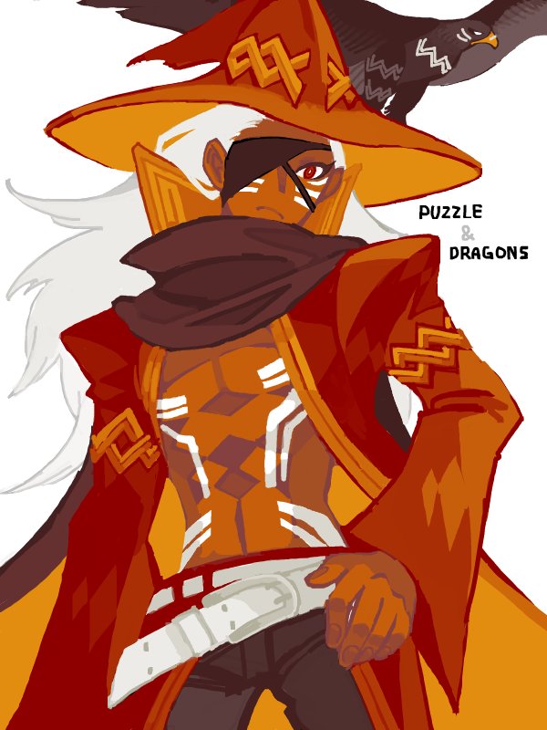 1boy animal animal_on_head bird bird_on_head bodypaint brown_scarf coat cowboy_shot dark-skinned_male dark_skin edarow eyepatch hand_on_own_hip hat hawk long_hair looking_at_viewer male_focus no_shirt on_head open_clothes open_coat puzzle_&_dragons red_coat red_eyes scarf simple_background solo toned toned_male white_background white_hair wizard_hat