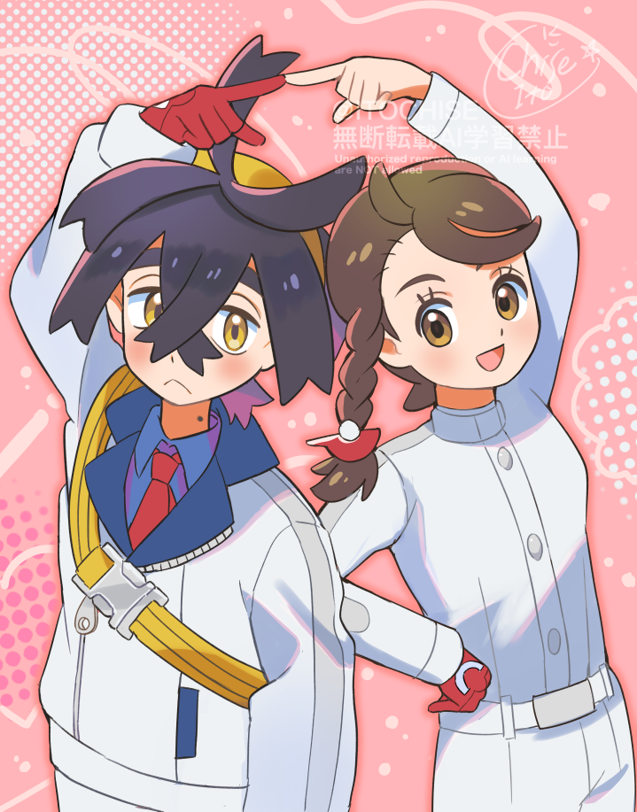1boy 1girl :d ahoge arm_up belt belt_buckle black_hair blue_shirt braid brown_eyes brown_hair buckle buttons collared_shirt colored_inner_hair commentary_request crossed_bangs eyelashes gloves hair_between_eyes hand_on_own_hip index_fingers_together jacket juliana_(pokemon) kieran_(pokemon) long_sleeves mole mole_on_neck multicolored_hair necktie nintendo open_mouth orange_(orangelv20) pink_background pokemon pokemon_scarlet_and_violet red_gloves red_necktie shirt single_glove smile white_jacket yellow_eyes