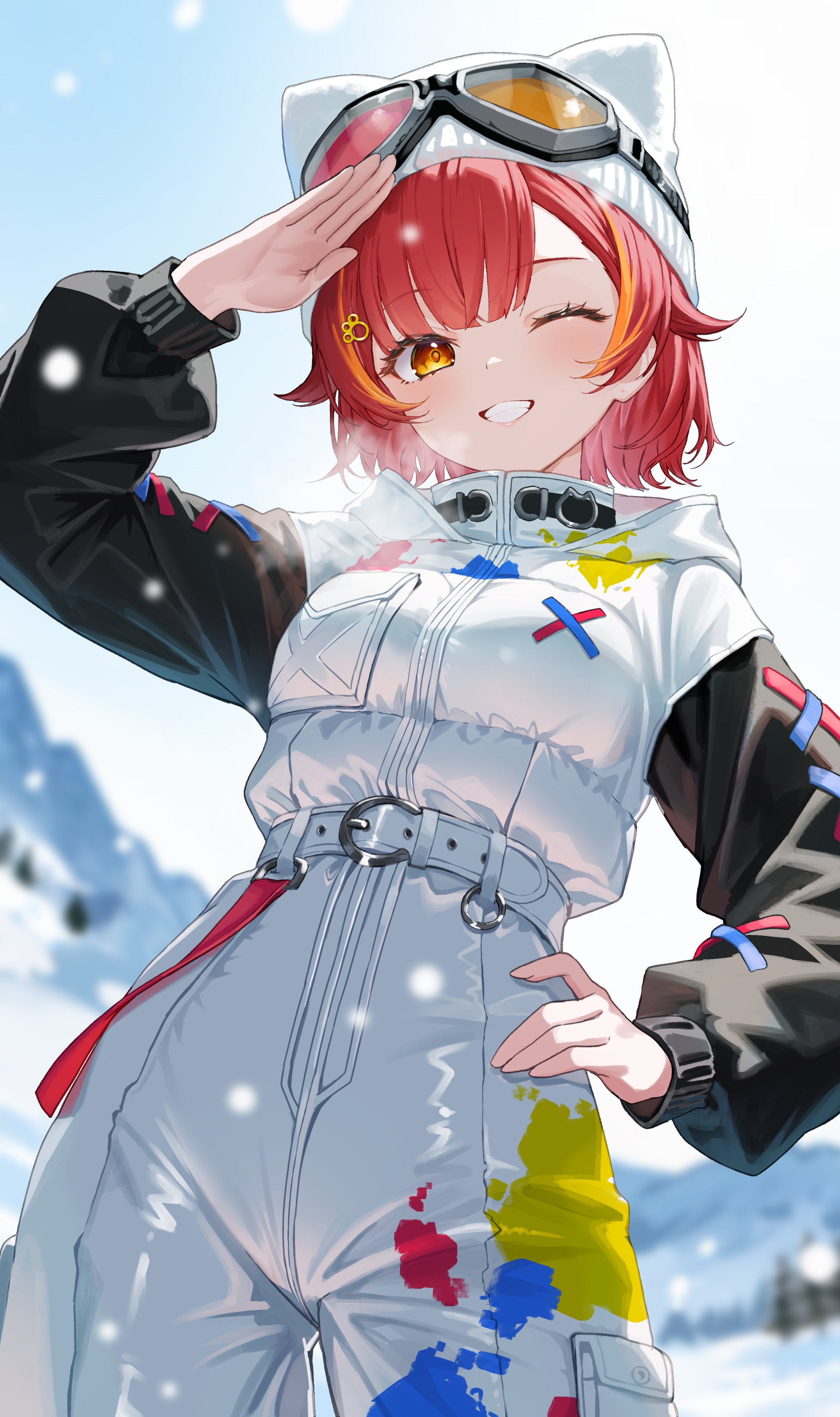 1girl absurdres alternate_costume animal_ear_headwear animal_ears asymmetrical_bangs beanie belt belt_buckle black_sleeves blunt_bangs blurry blurry_background buckle cold commentary_request contrapposto cowboy_shot cross-laced_clothes cross-laced_sleeves fake_animal_ears goggles goggles_on_headwear hair_flaps hair_ornament hand_on_own_hip hat highres hiruno_ushiro hood hood_down jacket jumpsuit light_blush long_sleeves looking_at_viewer multicolored_hair nekota_tsuna one_eye_closed orange_eyes outdoors padded_jacket paint_on_clothes paw_hair_ornament red_hair salute short_hair ski_goggles smile snowing solo streaked_hair teeth virtual_youtuber vspo! white_jumpsuit winter winter_clothes