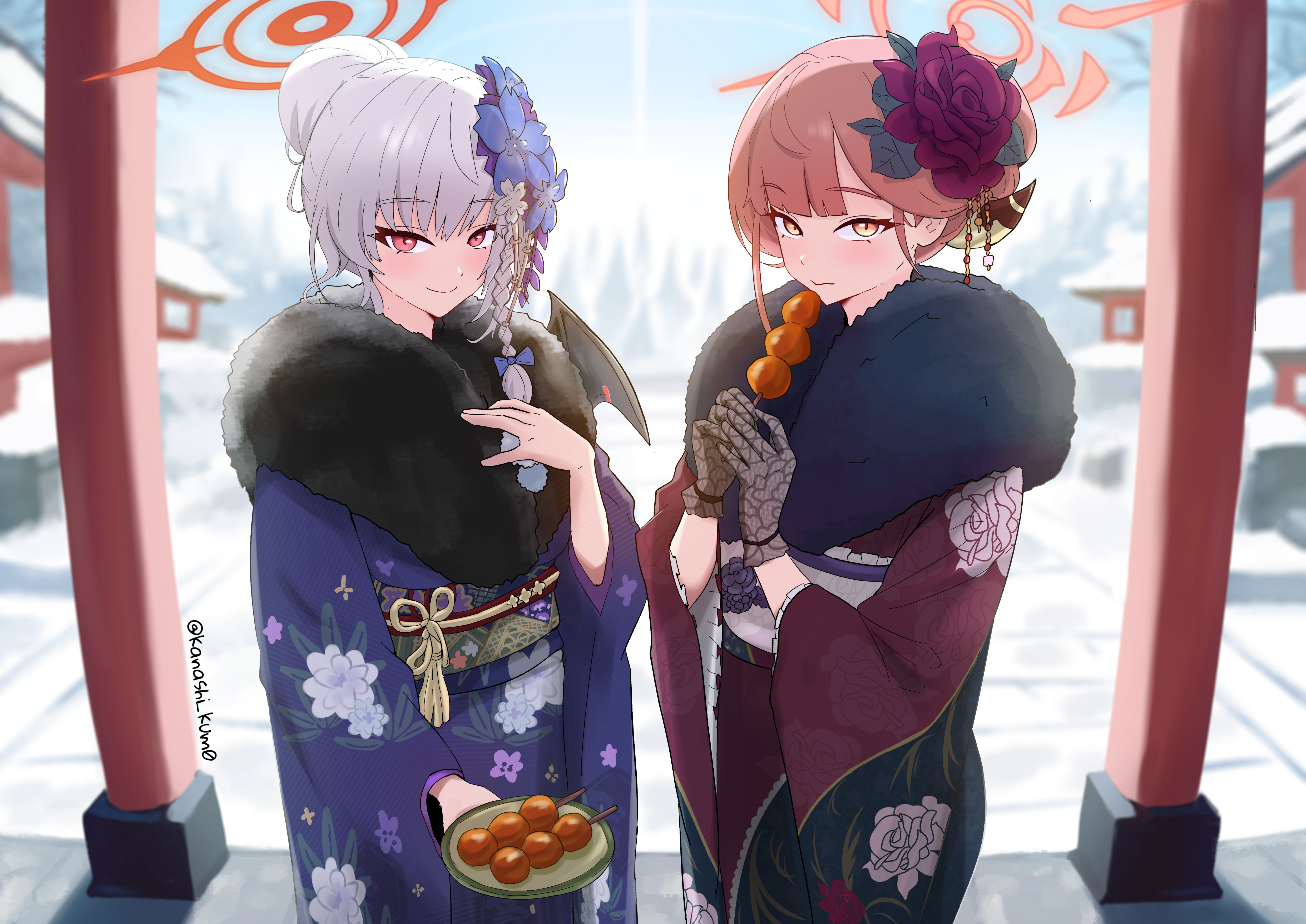 2girls absurdres aru_(blue_archive) aru_(new_year)_(blue_archive) black_gloves blue_archive blue_flower blush braid closed_mouth demon_girl demon_horns demon_wings floral_print floral_print_kimono flower food fur_trim gloves hair_between_eyes hair_bun hair_flower hair_ornament hair_over_shoulder hand_on_own_chest haruna_(blue_archive) haruna_(new_year)_(blue_archive) highres holding holding_plate holding_skewer horns japanese_clothes kanashi_kum0 kimono long_hair looking_at_viewer multiple_girls obi official_alternate_costume official_alternate_hairstyle plate print_kimono purple_kimono purple_sash red_eyes red_flower red_hair red_kimono sash sidelocks single_braid skewer smile snow white_hair white_sash wings yellow_eyes