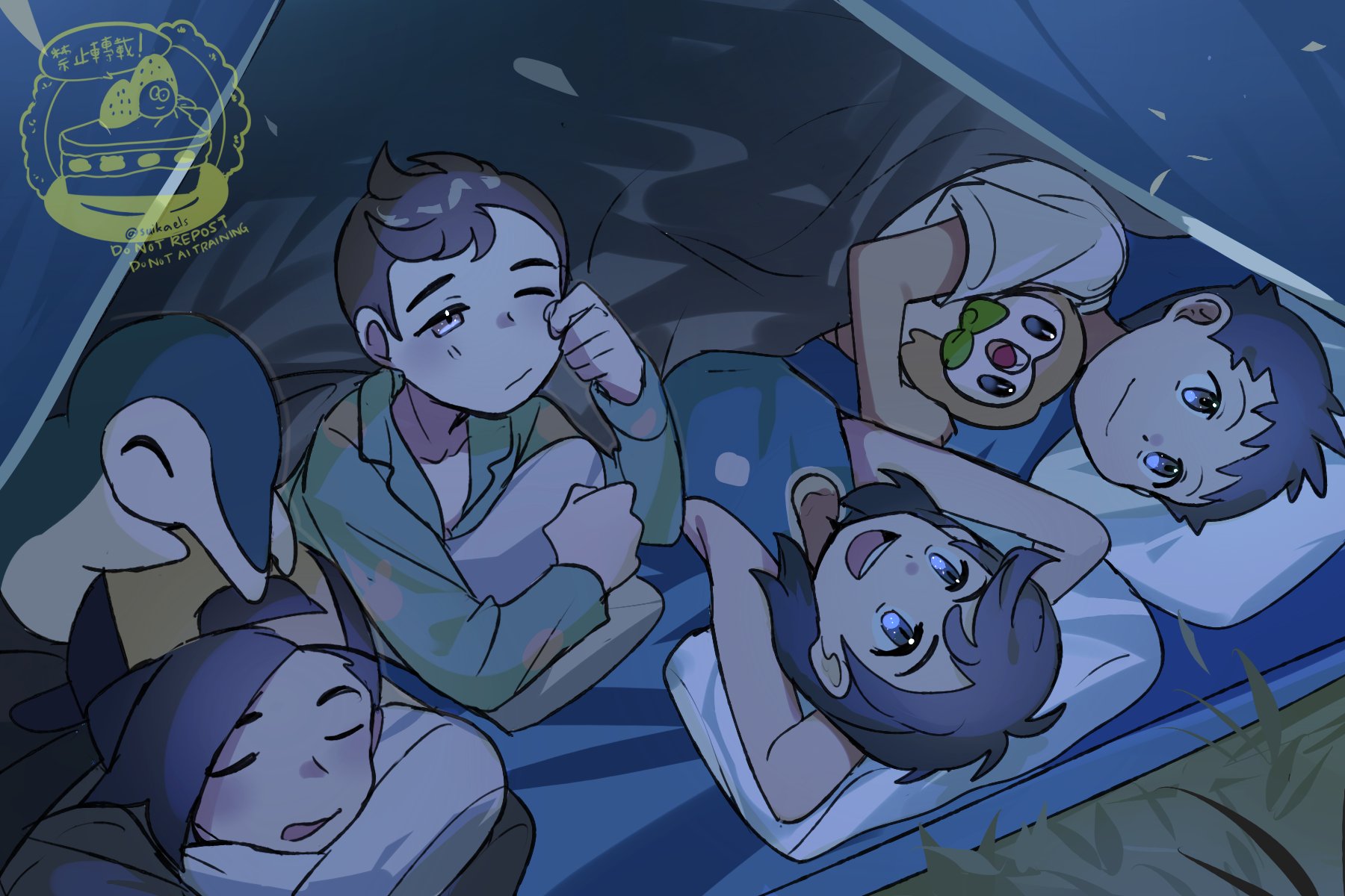 arms_behind_head artist_logo backwards_hat black_hair blanket brown_hair camping crossed_arms cyndaquil elio_(pokemon) ethan_(pokemon) gen_2_pokemon gen_7_pokemon green_pajamas hat highres logo lucas_(pokemon) lying nintendo on_side on_stomach pajamas pillow pokemon pokemon_(creature) pokemon_diamond/pearl/platinum pokemon_gold/silver/crystal pokemon_sword_and_shield pokemon_ultra_sun_and_ultra_moon rowlet rubbing_eyes shirt sleeping sleepwear smile suikaels t-shirt tank_top tent victor_(pokemon)