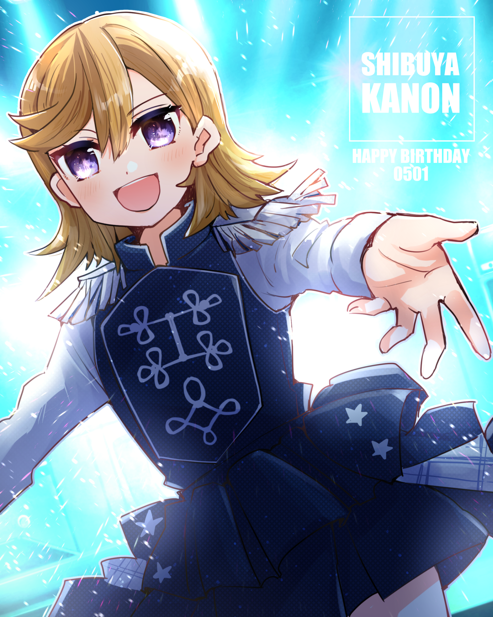 1girl :d backlighting blue_background blue_jacket blue_skirt blush character_name commentary_request cowboy_shot dated hair_between_eyes happy_birthday highres jacket kanduki_kamibukuro light_particles long_hair long_sleeves looking_at_viewer love_live! love_live!_superstar!! miniskirt official_alternate_costume open_mouth orange_hair outstretched_arms purple_eyes shibuya_kanon shirt sing!_shine!_smile! skirt smile solo white_shirt