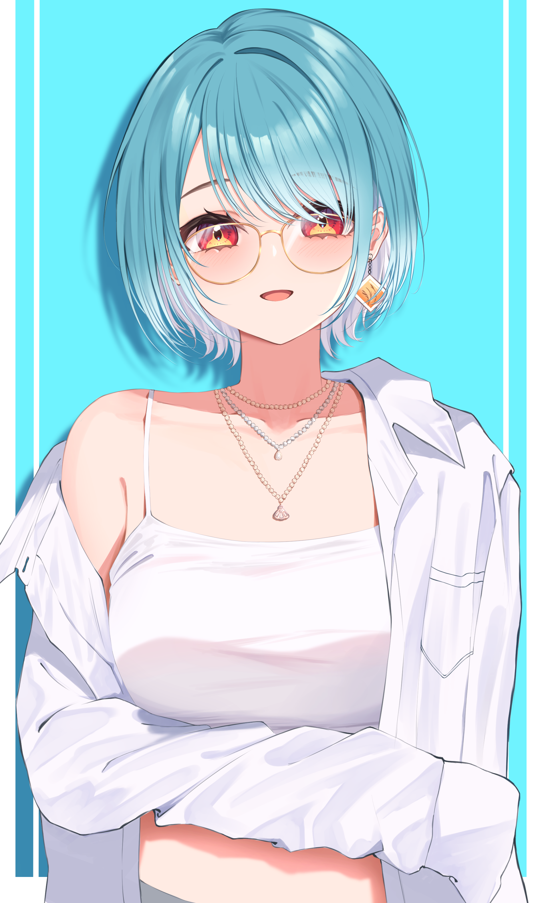 1girl absurdres blue_background blue_hair breasts camisole collarbone earrings glasses gradient_hair haru_(haru83380282) highres jewelry large_breasts midriff_peek multicolored_hair necklace open_clothes open_shirt parted_lips red_eyes shiranami_ramune shiranami_ramune_(4th_costume) shirt short_hair single_bare_shoulder single_earring single_off_shoulder sleeves_past_fingers sleeves_past_wrists solo spaghetti_strap upper_body virtual_youtuber vspo! white_camisole white_shirt
