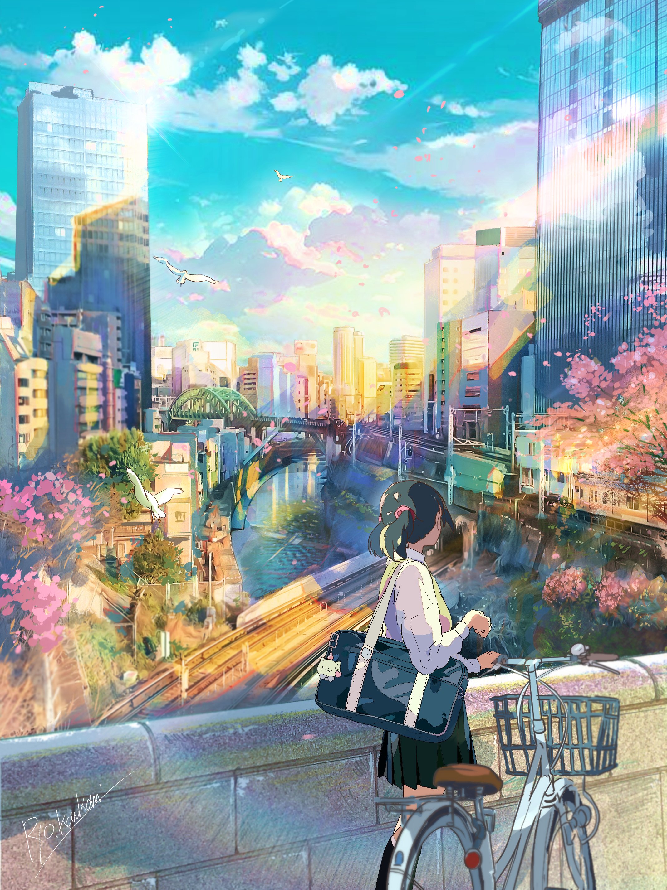 1girl absurdres bag bag_charm bicycle bird black_hair black_skirt bridge building canal charm_(object) cherry_blossoms city cityscape cloud highres long_sleeves morning original outdoors railroad_tracks reflection ryowelcome1 scenery school_bag school_uniform shirt signature skirt skyscraper solo spring_(season) standing sunlight white_bird white_shirt