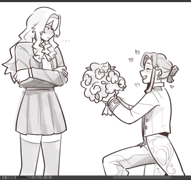 ... 2girls art_program_in_frame blush bouquet closed_eyes closed_mouth crossed_arms flower greyscale grin hair_up hairband heart holding holding_bouquet kneeling long_hair long_sleeves looking_at_another monochrome multiple_girls open_mouth pants pleated_skirt saijo_claudine seishou_music_academy_uniform shoujo_kageki_revue_starlight skirt smile szatiant tendo_maya thighhighs tuxedo yuri