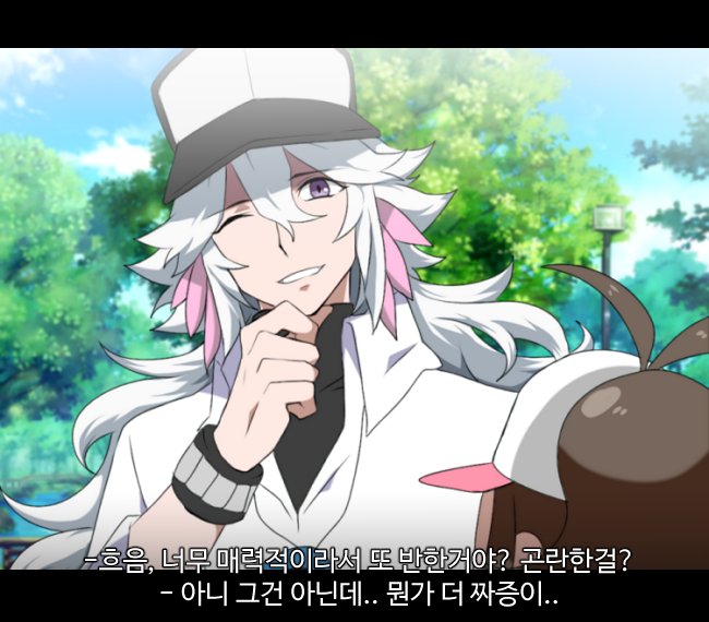 1boy 1girl antenna_hair baseball_cap commentary_request cosplay crossover fate/grand_order fate_(series) hand_on_own_chin hat hilda_(pokemon) korean_commentary korean_text lamppost letterboxed merlin_(fate) n_(pokemon) n_(pokemon)_(cosplay) nintendo one_eye_closed pokemon pokemon_black_and_white purple_eyes subtitled translation_request tree uni_(unnny) white_hair wristband