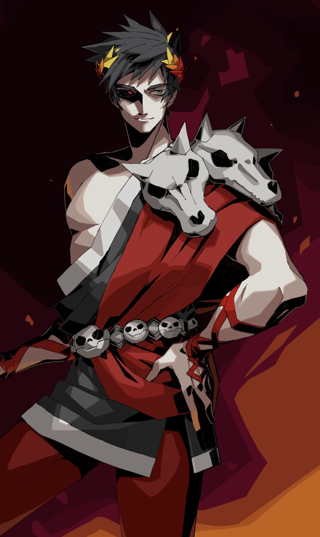 1boy ancient_greek_clothes animal_skull black_hair black_sclera closed_mouth colored_sclera greco-roman_clothes green_eyes hades_(series) hades_1 hand_on_own_hip heterochromia highres laurel_crown male_focus mismatched_sclera red_eyes short_hair single_bare_shoulder skull skull_belt smile solo yoshioka_suke zagreus_(hades)