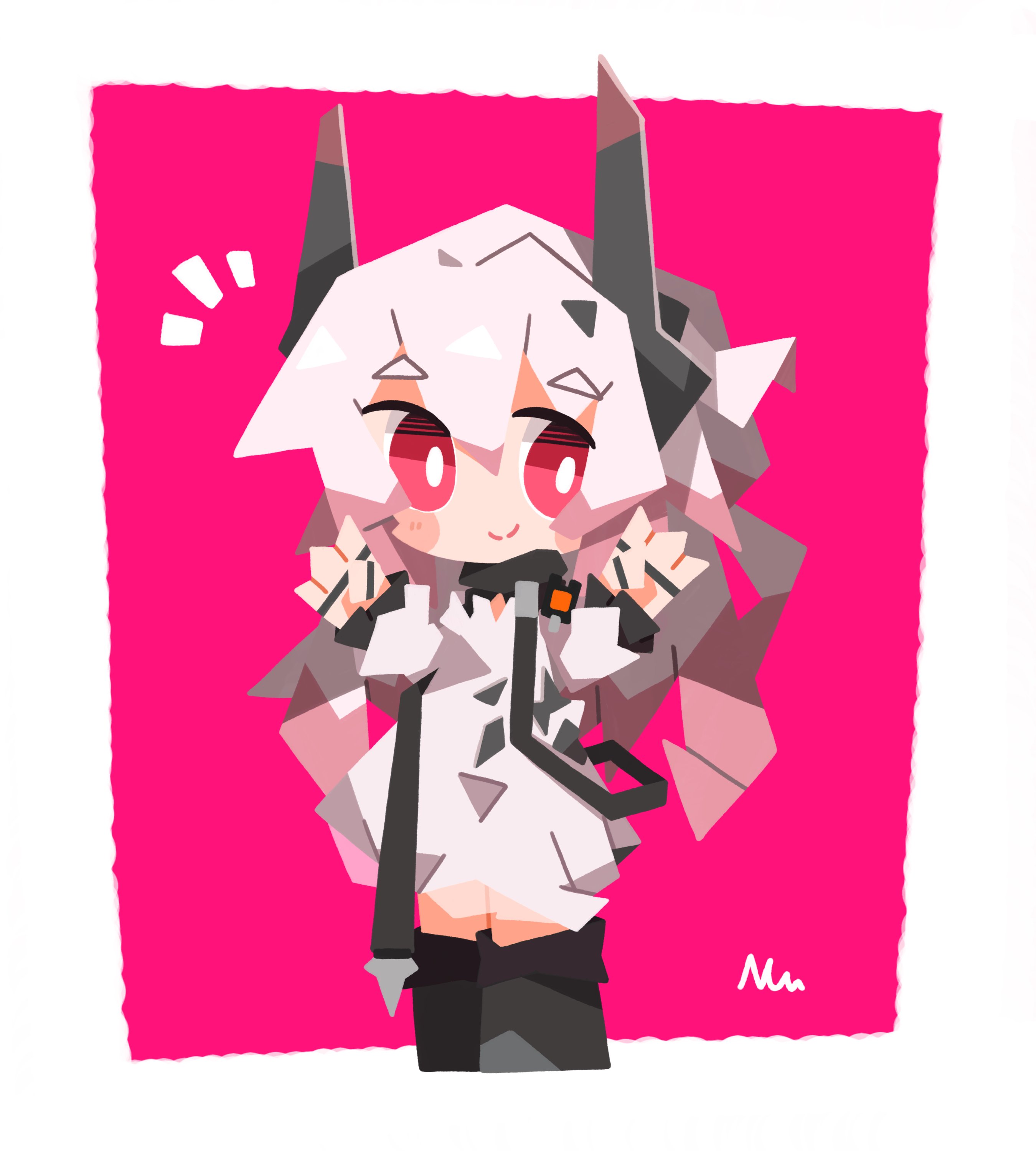 1girl ^^^ absurdres arknights black_boots boots bright_pupils chibi closed_mouth dress full_body highres horns jewelry knee_boots long_hair long_sleeves looking_at_viewer multiple_rings nuu_(nu-nyu) pink_background pink_eyes pink_hair ring ring_on_every_finger signature smile solo standing theresa_(arknights) two-tone_background very_long_hair white_background white_dress
