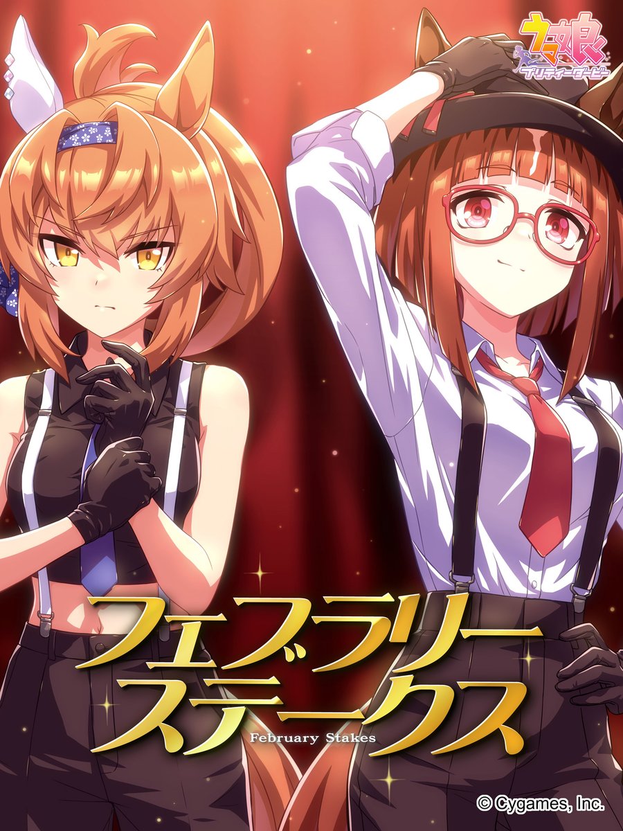 2girls animal_ears bare_shoulders black_gloves black_pants black_shirt blue_hairband blue_necktie breasts brown_hair collared_shirt contrast_suspenders copyright_logo ear_covers ears_through_headwear furioso_(umamusume) glasses gloves hair_between_eyes hairband highres horse_ears horse_girl horse_tail large_breasts logo long_sleeves looking_at_viewer midriff multiple_girls navel necktie official_art pants ponytail red-framed_eyewear red_eyes red_necktie shirt short_hair single_ear_cover sleeveless sleeveless_shirt smile suspenders tail transcend_(umamusume) umamusume white_hair white_shirt yellow_eyes