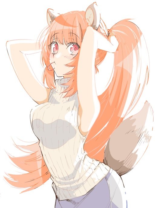 1girl animal_ears arms_up bare_shoulders blue_pants breasts commentary_request hair_tie_in_mouth light_blush long_hair looking_at_viewer medium_breasts momojiri2002 mouth_hold orange_hair pants ponytail raccoon_ears raccoon_girl raccoon_tail raphtalia red_eyes ribbed_sweater simple_background sleeveless sleeveless_sweater sleeveless_turtleneck solo sweater tail tate_no_yuusha_no_nariagari turtleneck turtleneck_sweater tying_hair upper_body white_background white_sweater