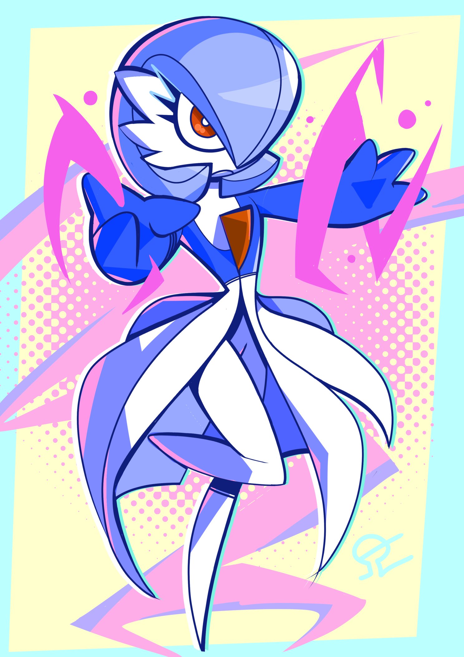 alternate_color alvh_omega blue_hair blue_skin bob_cut colored_skin dress gardevoir gen_3_pokemon hair_over_one_eye highres multicolored_skin nintendo pink_eyes pokemon pokemon_(creature) shiny_pokemon signature two-tone_skin white_dress white_skin