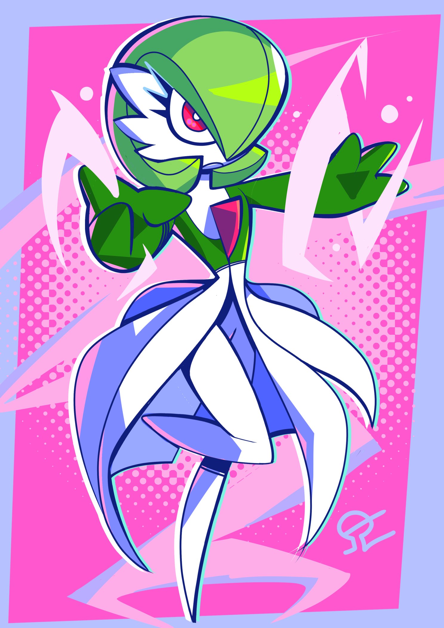 alvh_omega bob_cut colored_skin dress gardevoir gen_3_pokemon green_hair green_skin hair_over_one_eye highres multicolored_skin nintendo pink_eyes pokemon pokemon_(creature) purple_background signature two-tone_skin white_dress white_skin