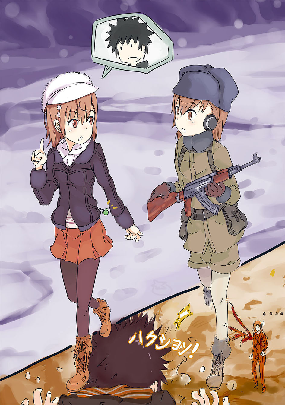 ... 2boys 2girls belt belt_pouch black_hair black_thighhighs boots breasts brown_boots brown_eyes brown_hair newsboy_cap commentary_request fiamma_of_the_right flower full_body gekota gun hair_between_eyes hair_flower hair_ornament hand_up hands_up hat highres holding holding_gun holding_weapon jacket kalashnikov_rifle kamijou_touma light_blush long_sleeves looking_at_another medium_hair miniskirt misaka_imouto misaka_imouto_10777 misaka_mikoto multiple_boys multiple_girls official_style open_mouth orange_skirt outdoors pleated_skirt pouch purple_background purple_jacket scarf short_hair short_shorts shorts siblings sisters skirt snow speech_bubble spiked_hair sweatdrop talking thighhighs toaru_majutsu_no_index toaru_majutsu_no_index:_old_testament tomato_(lsj44867) walking weapon white_hat white_thighhighs winter_clothes