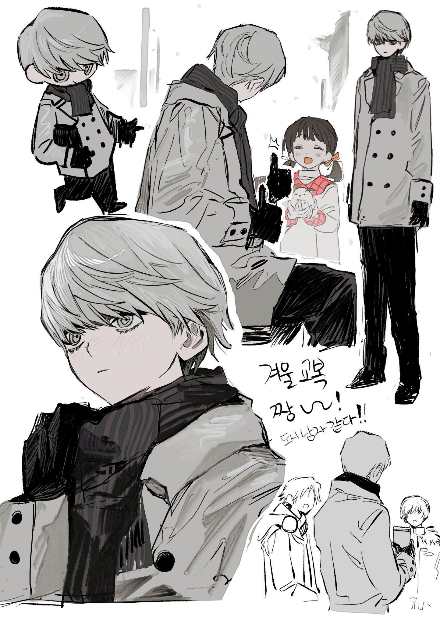 1girl 3boys black_gloves chibi chibi_inset child closed_eyes coat collage cup double_thumbs_up doujima_nanako expressionless full_body gloves goguma_wagamja grey_coat grey_eyes grey_hair grey_scarf hanamura_yousuke highres holding holding_cup korean_text looking_at_another multiple_boys narukami_yu open_mouth persona persona_4 scarf short_hair sitting sketch_inset smile thumbs_up twintails upper_body very_short_hair white_background