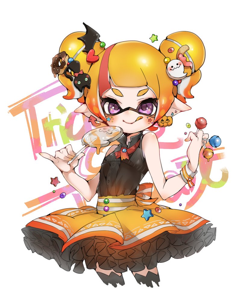 1girl :q bare_shoulders black_shirt black_thighhighs breasts candy cat_hair_ornament closed_mouth collared_shirt colored_tongue commentary cropped_legs donut_hair_ornament double_bun dress_shirt earrings eating english_commentary food food-themed_hair_ornament ghost_hair_ornament hair_bun hair_ornament halloween heart heart_hair_ornament holding holding_food inkling inkling_girl inkling_player_character jewelry lollipop looking_at_viewer matsushita_(matsudbox) multicolored_hair nintendo orange_hair orange_skirt orange_tongue pointy_ears purple_eyes red_hair shirt short_hair single_wrist_cuff skirt sleeveless sleeveless_shirt small_breasts smile solo splatoon_(series) streaked_hair tentacle_hair thighhighs tongue tongue_out two-tone_hair white_wrist_cuffs wing_hair_ornament wrist_cuffs