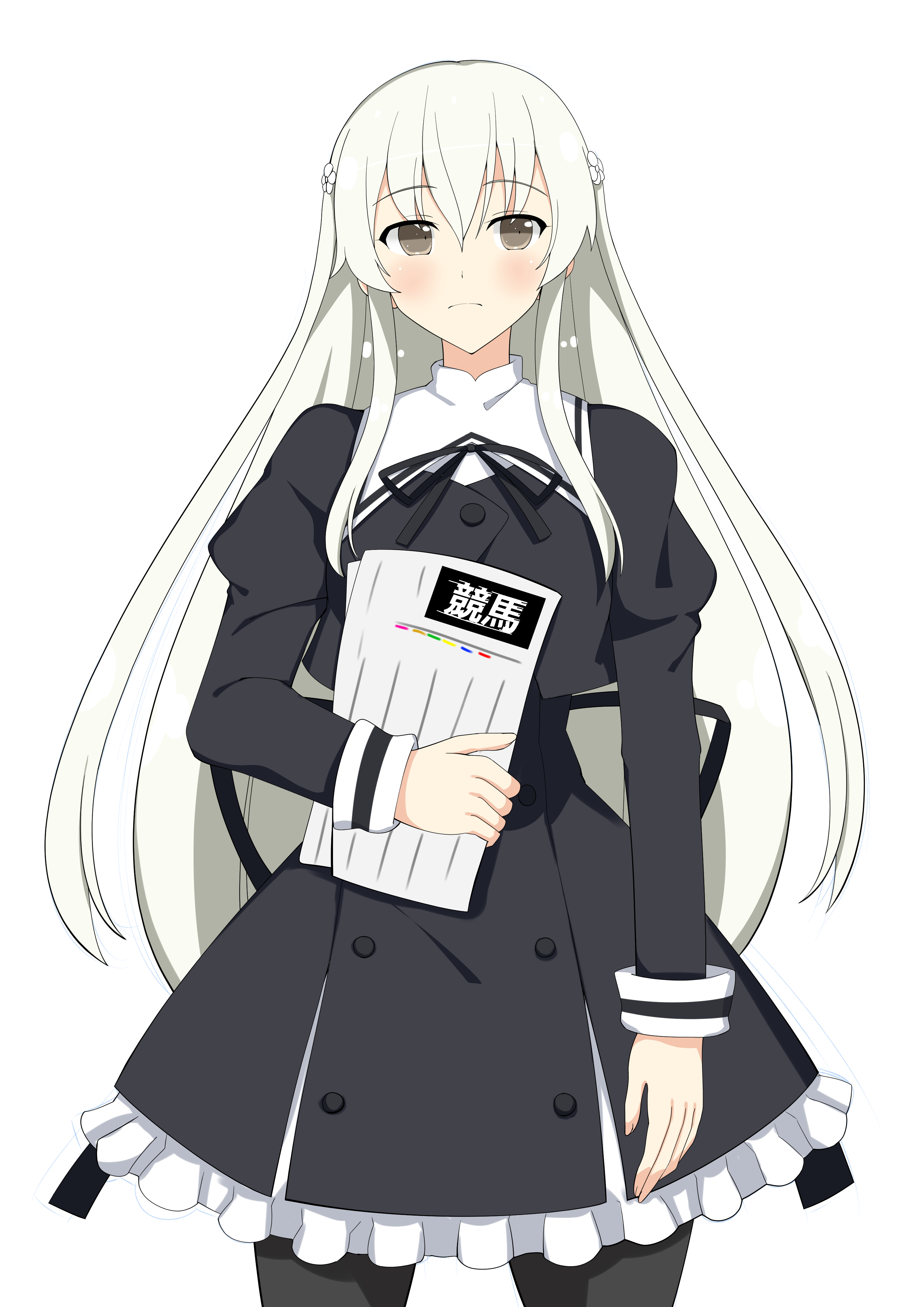 1girl absurdres arm_at_side assault_lily black_pantyhose black_ribbon black_skirt blush brown_eyes buttons closed_mouth commentary cowboy_shot cropped_jacket egawa_kusumi flower frilled_skirt frills hair_between_eyes hair_flower hair_ornament hand_up high-waist_skirt highres holding holding_paper juliet_sleeves long_hair long_sleeves looking_at_viewer neck_ribbon pantyhose paper puffy_sleeves ribbon school_uniform senri_(senri03151221) sidelocks simple_background skirt solo standing translated two_side_up very_long_hair white_background white_flower white_hair yurigaoka_girls_academy_school_uniform