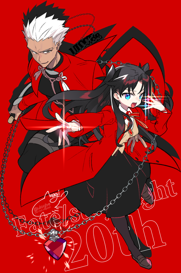 1boy 1girl archer_(fate) black_hair black_pants black_skirt blue_eyes breasts brown_vest coat collared_shirt cropped_jacket dark-skinned_male dark_skin fate/stay_night fate_(series) full_body gem grey_eyes hair_ribbon jacket jewelry kanshou_&_bakuya_(fate) long_hair long_sleeves looking_at_viewer medium_breasts necklace negi_(ulog'be) open_mouth outstretched_arm pants parted_bangs pendant red_background red_coat red_jacket ribbon shirt short_hair skirt smile tiara tohsaka_rin two_side_up vest white_hair white_shirt