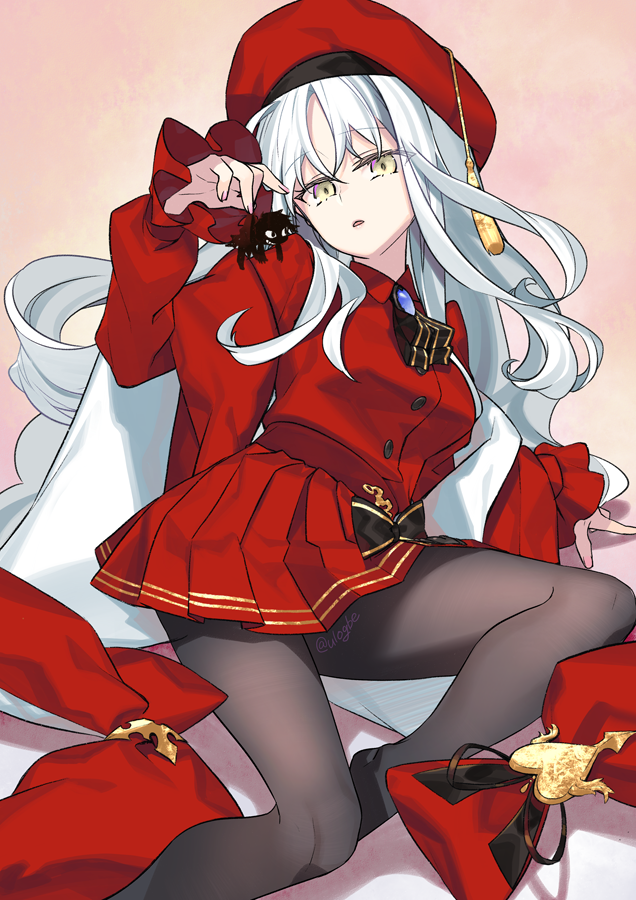 1boy 1girl angra_mainyu_(fate) beret breasts brooch brown_pantyhose caren_hortensia caren_hortensia_(amor_caren)_(second_ascension) dress fate/grand_order fate_(series) gold_trim hat jewelry long_hair long_sleeves looking_at_viewer medium_breasts mini_person neck_ribbon negi_(ulog'be) pantyhose parted_lips pink_background red_dress red_hat ribbon shawl shroud_of_magdalene thighs wavy_hair white_hair yellow_eyes