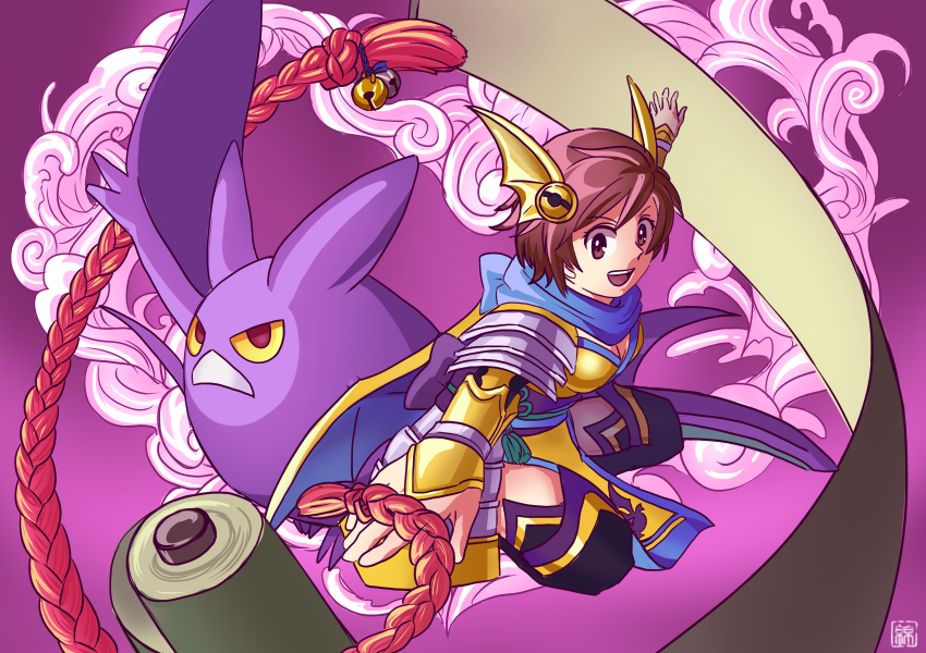armor blue_scarf breasts brown_eyes brown_hair cleavage crobat gen_2_pokemon hair_ornament japanese_clothes medium_hair nene_(sengoku_musou) ninja nintendo pokemon pokemon_conquest scarf scroll sengoku_musou smile source_request thighhighs thighs