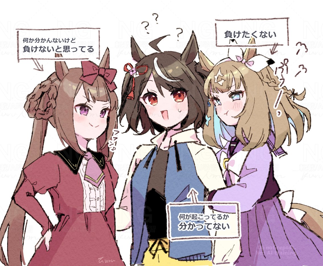 3girls ahoge almond_eye_(umamusume) animal_ears annoyed black_hair breasts brown_hair casual collarbone commentary_request hair_ornament hair_rings hairband horse_ears horse_girl kitasan_black_(casual)_(umamusume) kitasan_black_(umamusume) kurumi_poke long_hair looking_at_viewer medium_breasts multiple_girls red_eyes ribbon school_uniform smile sweep_tosho_(casual)_(umamusume) sweep_tosho_(umamusume) tracen_school_uniform translation_request twintails umamusume umamusume_horse_relations white_background