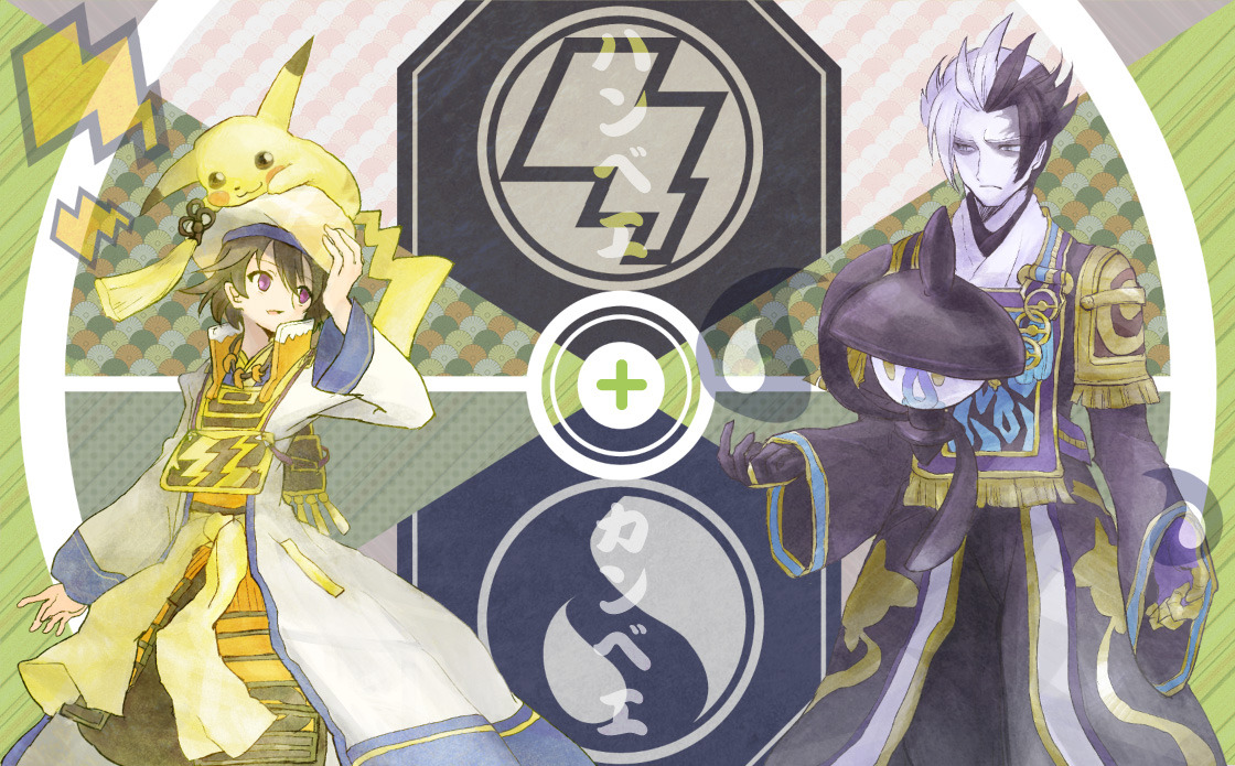 armor beret black_hair coat colored_skin gen_1_pokemon gen_5_pokemon gloves grey_eyes grey_skin hat japanese_clothes jewelry kimono kuroda_kanbei_(sengoku_musou) lampent magatama magatama_necklace multicolored_hair necklace nintendo on_head pikachu pokemon pokemon_(creature) pokemon_conquest pokemon_on_head purple_eyes sengoku_musou takenaka_hanbei_(sengoku_musou) two-tone_hair