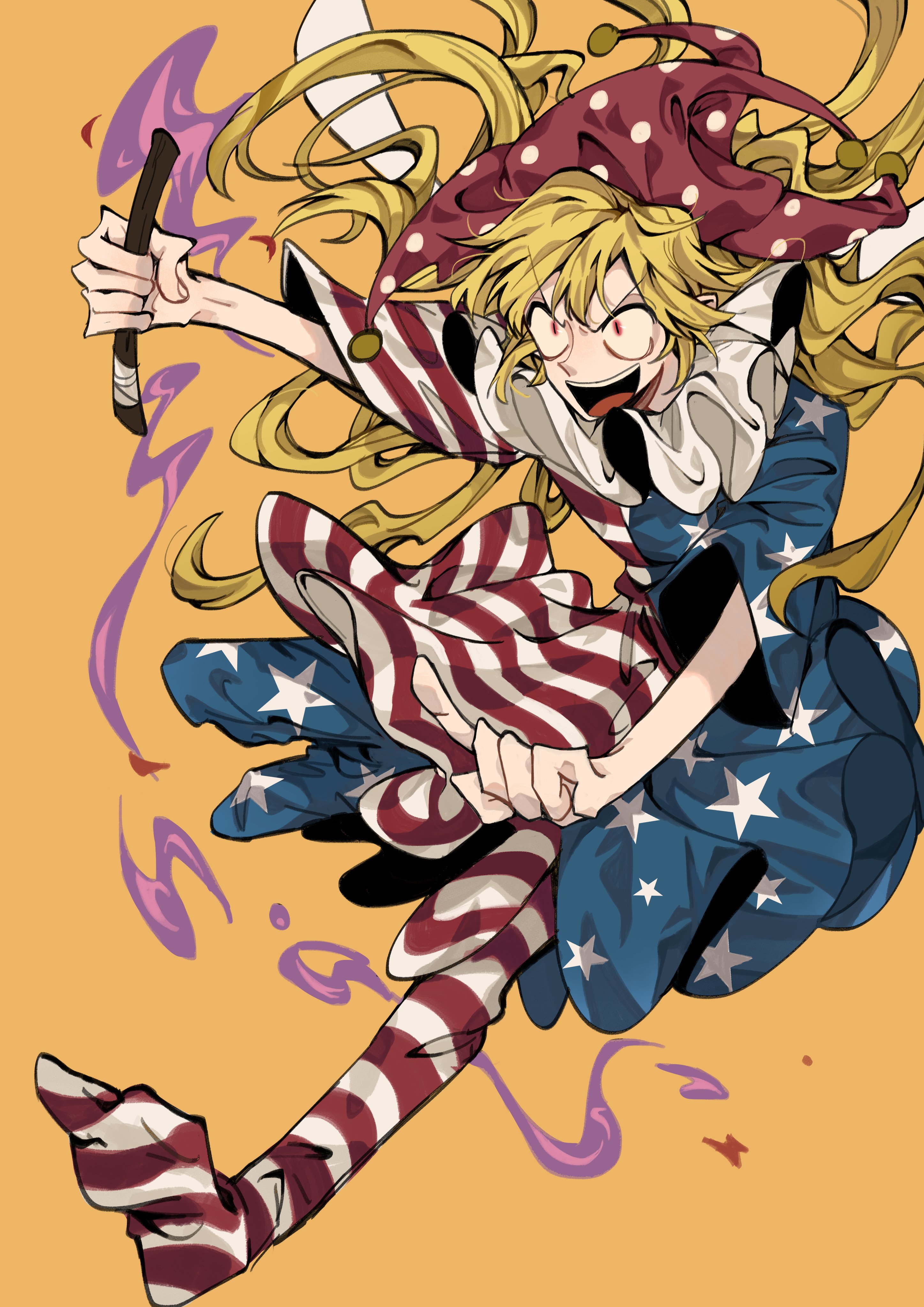 1girl absurdres american_flag_dress american_flag_legwear asymmetrical_legwear blonde_hair clownpiece commentary dress fairy_wings fire floating_hair hair_between_eyes hat highres holding holding_torch iampenguinj index_finger_raised jester_cap long_hair looking_ahead mismatched_legwear multicolored_dress multicolored_pantyhose neck_ruff no_shoes open_mouth orange_background pantyhose pointing polka_dot_headwear purple_fire red_eyes short_sleeves simple_background smile solo star_(symbol) star_print striped_clothes untranslatable_commentary teeth torch touhou upper_teeth_only v-shaped_eyebrows very_long_hair wings