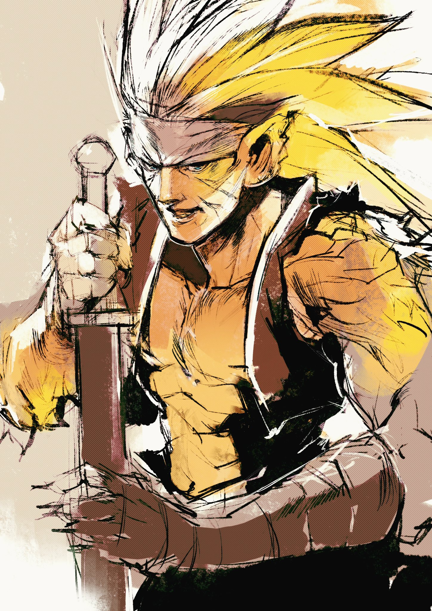 1boy abs bare_pectorals black_vest blonde_hair blue_eyes breath_of_fire breath_of_fire_iii cat_boy collarbone commentary_request cowboy_shot facial_mark headband highres holding holding_sword holding_weapon kannoaki long_hair male_focus navel pants pectorals pointy_ears rei_(breath_of_fire) sketch solo sword torn_clothes torn_sleeves vest weapon white_headband