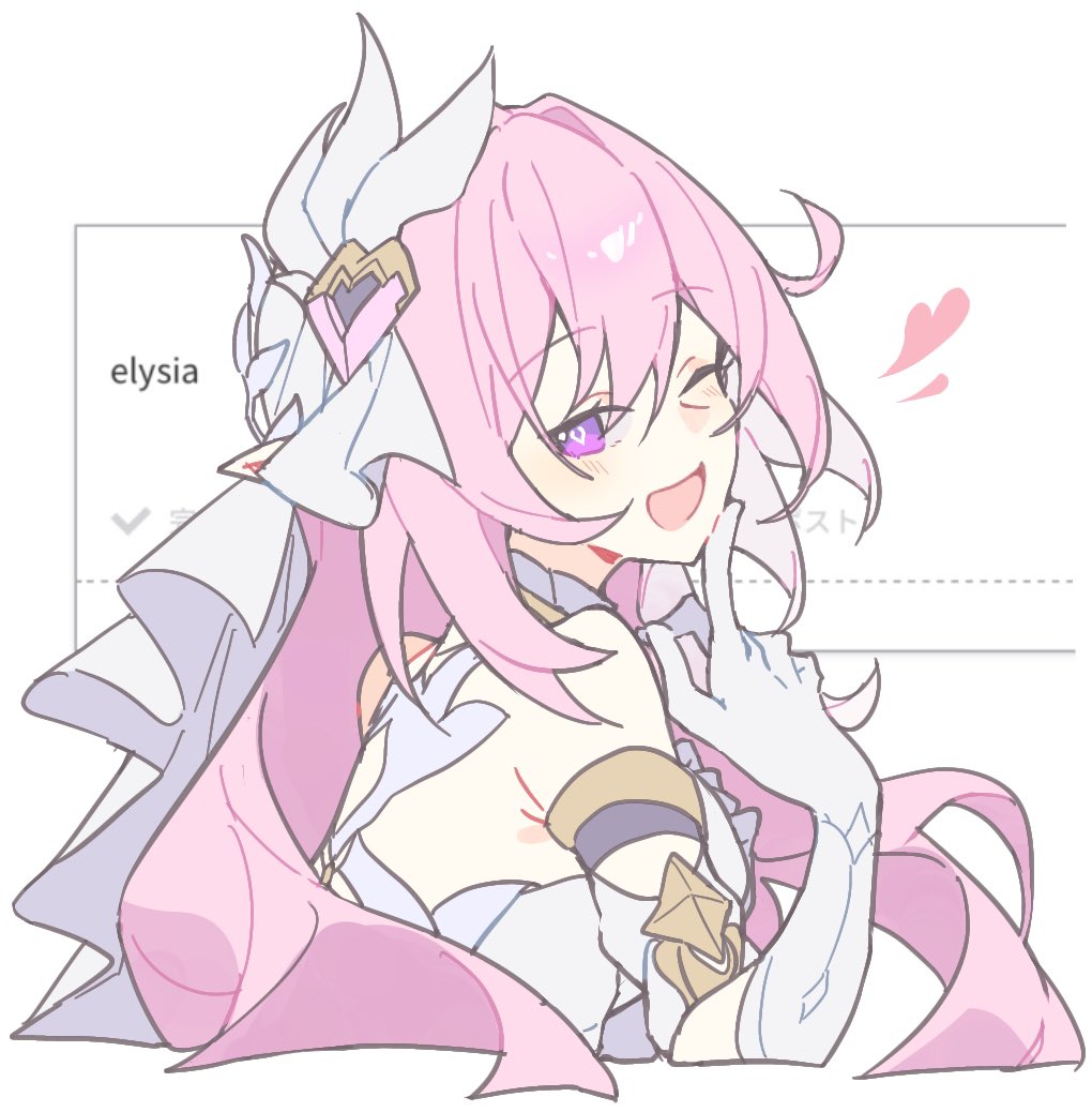 1girl commentary_request cropped_torso elysia_(herrscher_of_human:_ego)_(honkai_impact) elysia_(honkai_impact) finger_to_own_chin gloves honkai_(series) honkai_impact_3rd long_hair nonaa4141 one_eye_closed open_mouth pink_hair purple_eyes request_inset smile solo veil white_gloves white_veil