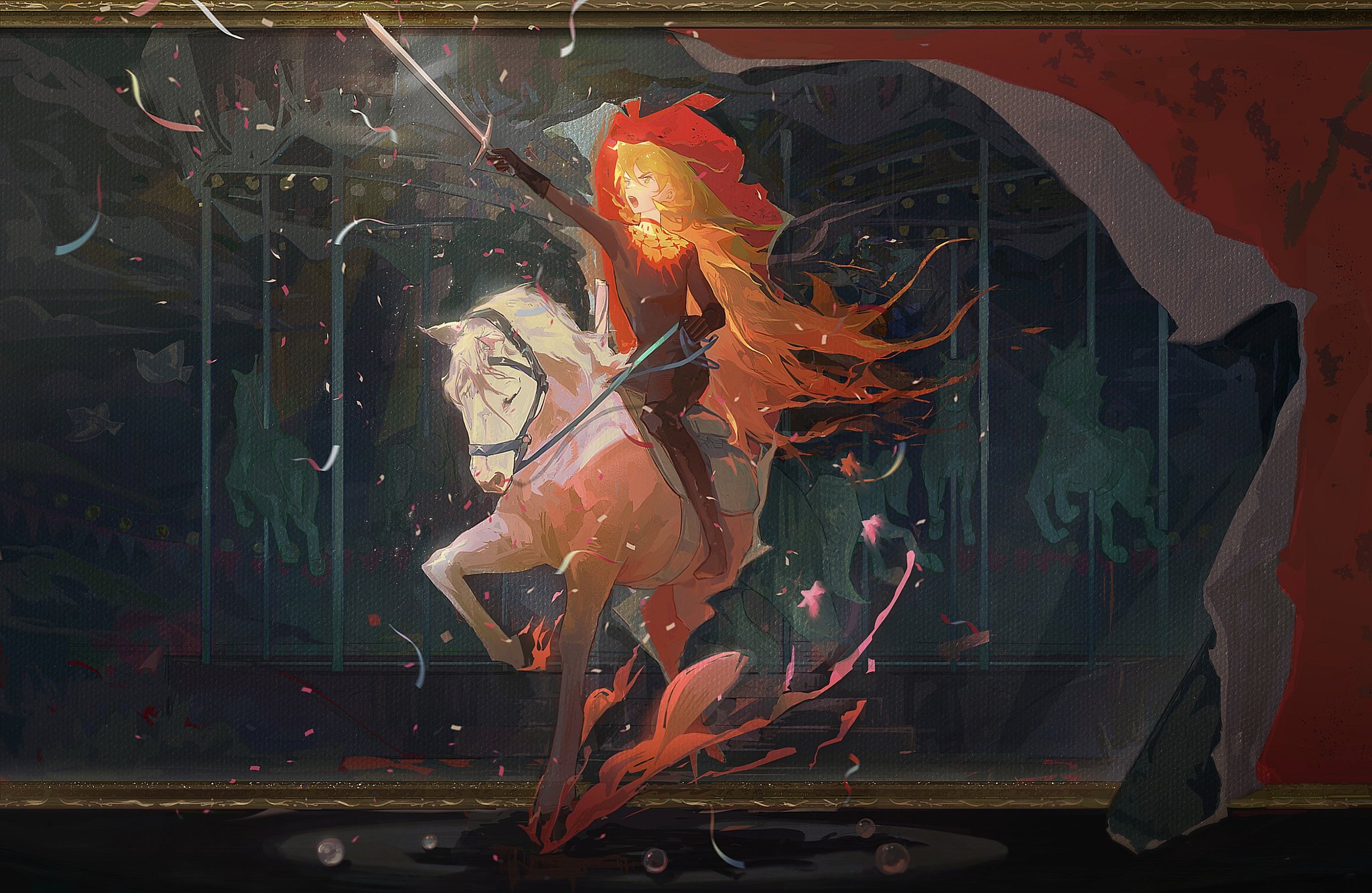 1girl arm_up ball biexuejianzhu black_bodysuit blonde_hair bodysuit carousel confetti don_quixote_(project_moon) highres holding holding_sword holding_weapon horse horseback_riding limbus_company long_hair looking_ahead mili_(band) picture_frame project_moon riding solo spotlight sword through_medium through_painting very_long_hair weapon white_horse yellow_eyes