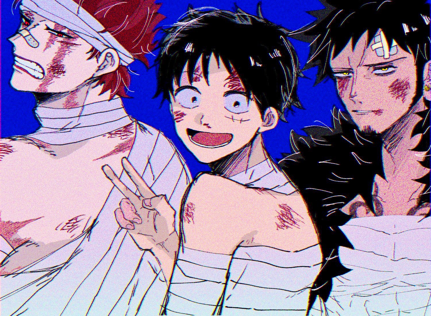 3boys ajtm007 bandaged_head bandaged_torso bandages bandaid bandaid_on_face bandaid_on_nose black_hair blood blood_on_face blue_background clenched_teeth commentary_request eustass_kid facial_hair fur_trim goatee looking_at_viewer male_focus monkey_d._luffy multiple_boys one_piece open_mouth red_eyes red_hair scar scar_on_face short_hair sideburns simple_background smile teeth trafalgar_law v yellow_eyes