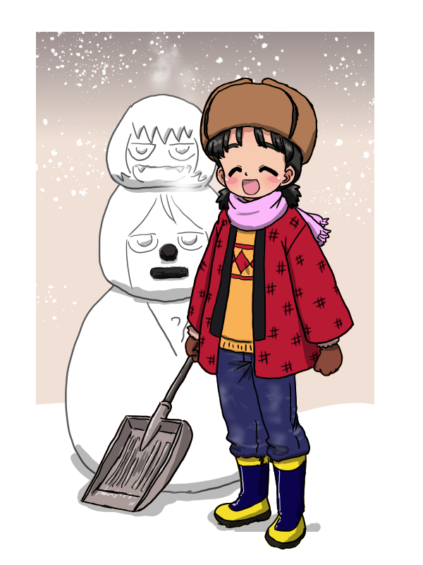 1girl alternate_costume black_hair blue_boots blue_pants boots brown_gloves brown_hat character_snowman closed_eyes denim girls_und_panzer gloves gradient_background hat holding holding_shovel jacket jeans katyusha_(girls_und_panzer) nina_(girls_und_panzer) nonna_(girls_und_panzer) open_mouth orange_sweater pants pink_scarf red_jacket scarf short_hair short_twintails shovel smile snow_boots snow_shovel snowing snowman sweater takahashi_kurage twintails ushanka winter winter_clothes