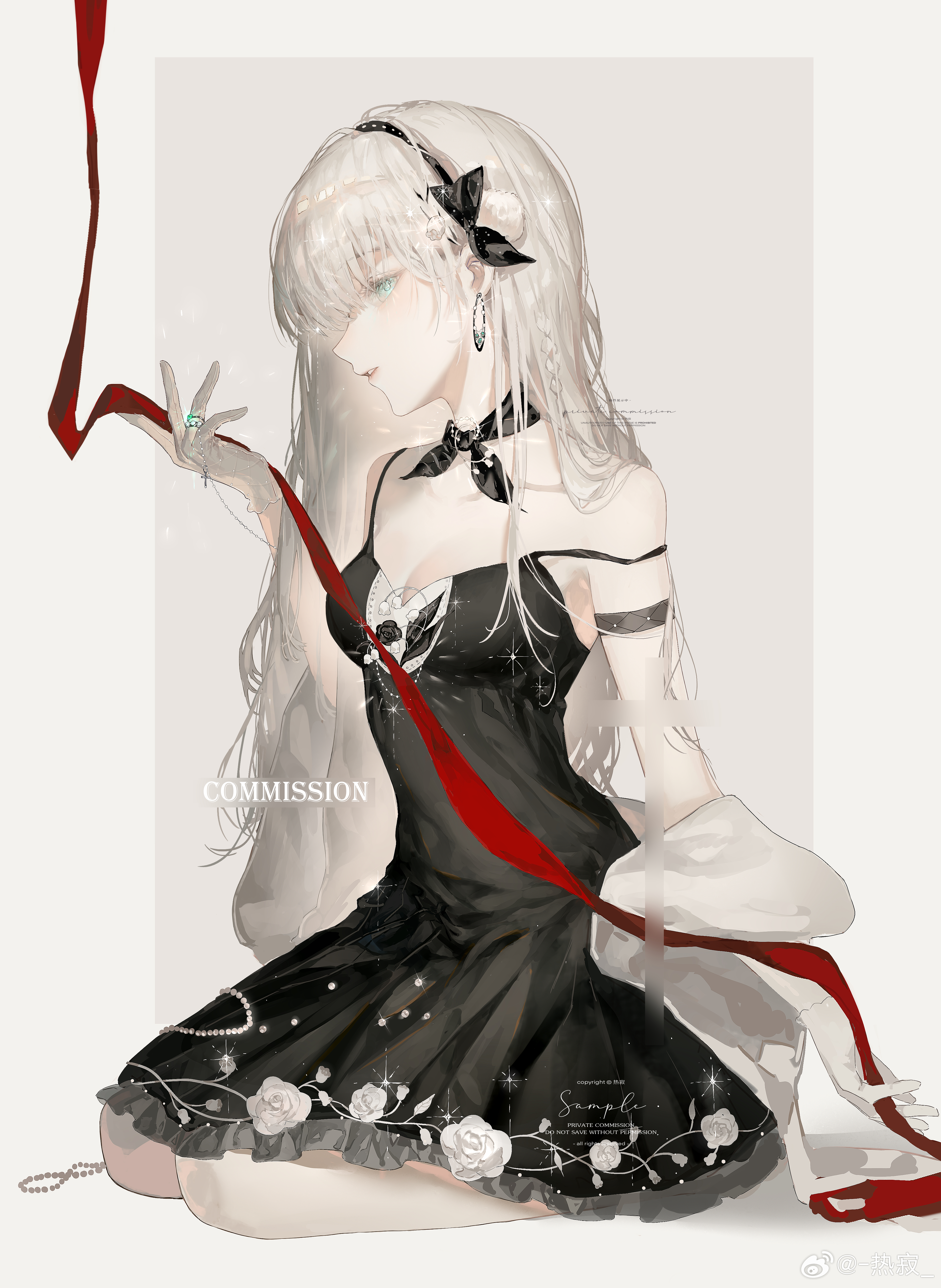 1girl absurdres black_dress black_skirt dress green_eyes hair_ribbon highres kneeling long_hair on_one_knee red_ribbon reji_(weibo_6496333450) ribbon skirt suspender_skirt suspenders white_hair