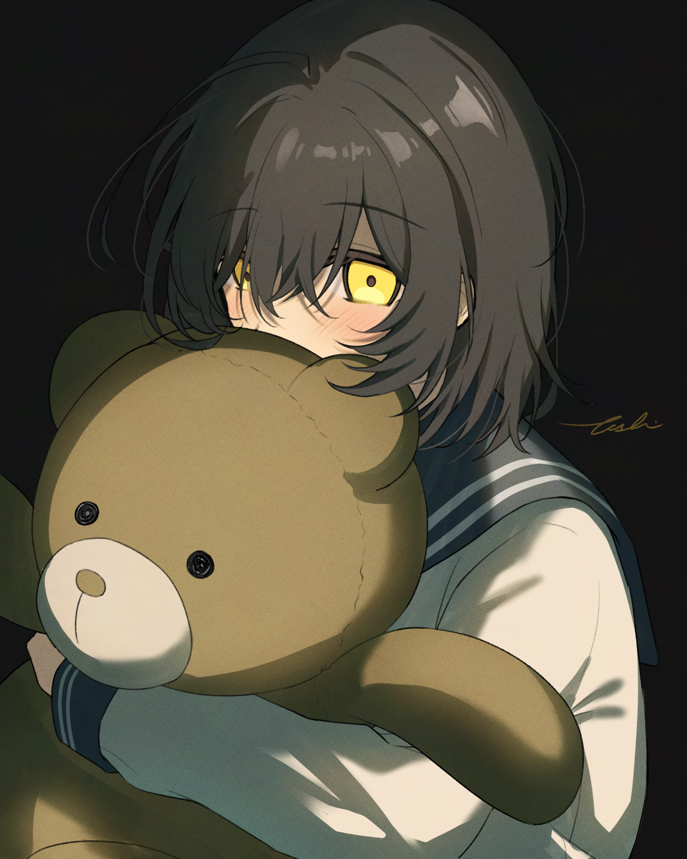 1girl absurdres black_background black_hair black_sailor_collar blush commentary_request hair_between_eyes highres hug hug_from_behind long_sleeves original sailor_collar school_uniform serafuku shirt signature simple_background sleeves_past_wrists solo stuffed_animal stuffed_toy tasi_y teddy_bear upper_body white_shirt yellow_eyes