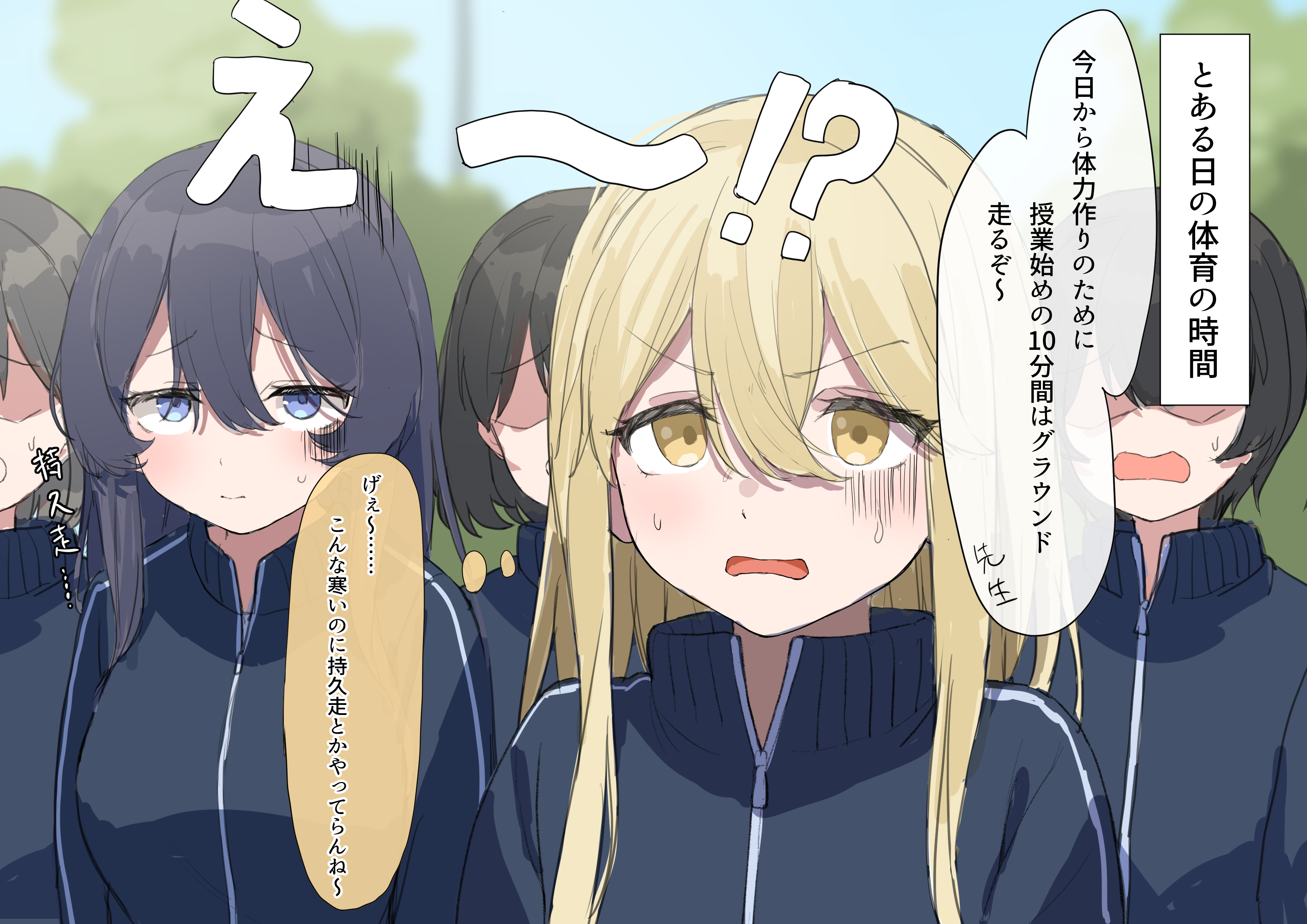 6+girls absurdres black_hair black_jacket blonde_hair blue_sky blush brown_hair closed_mouth commentary_request day highres jacket lemontyoisy_r18 long_hair multiple_girls open_mouth original outdoors purple_eyes school_uniform short_hair sky speech_bubble sweatdrop track_jacket translation_request yellow_eyes