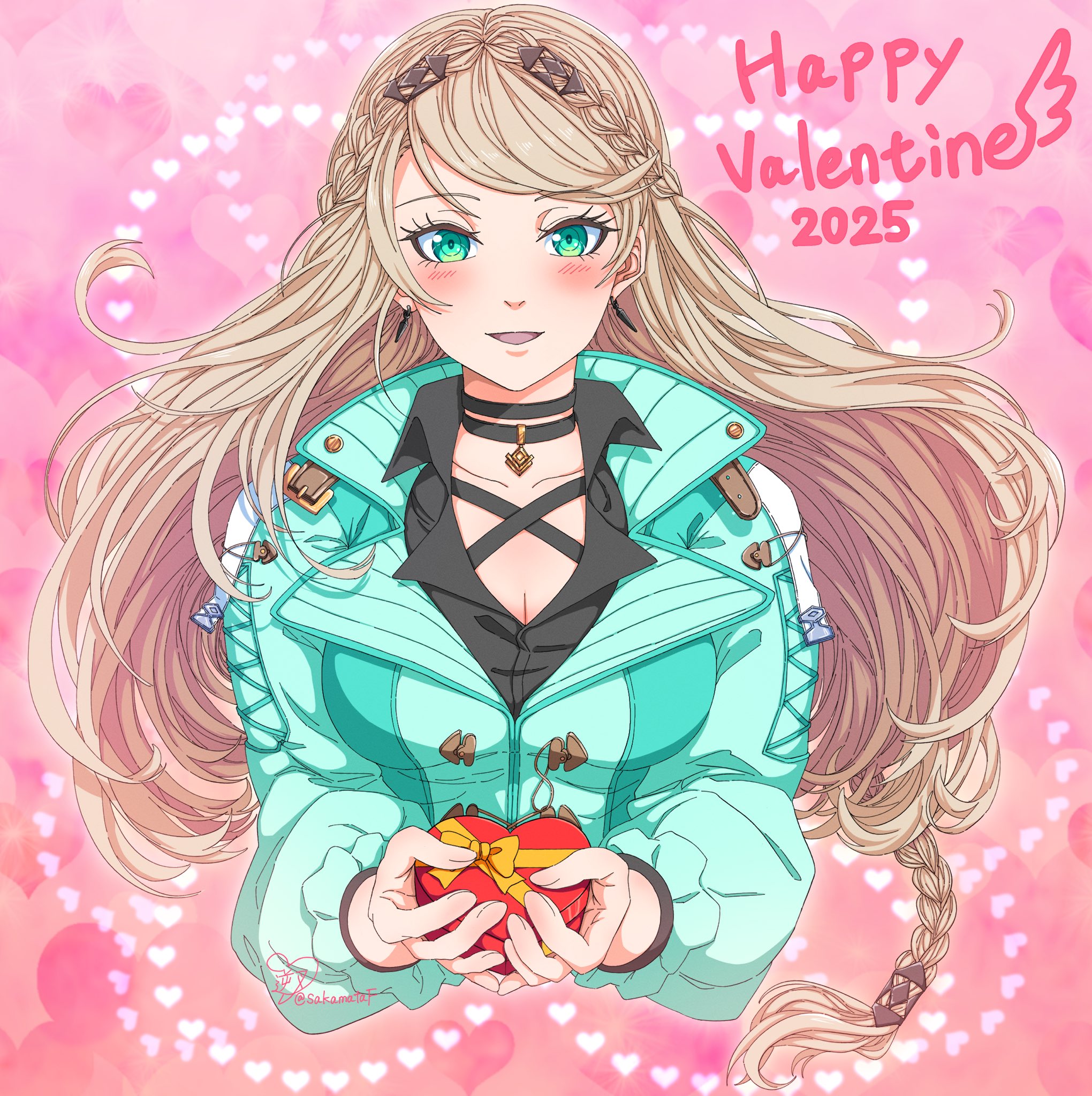 1girl blonde_hair box braid breasts cleavage coat crown_braid dated earrings eiyuu_densetsu elaine_auclair english_text floating_hair gift green_eyes happy_valentine heart heart-shaped_box high_collar highres holding holding_gift incoming_gift jewelry kai_no_kiseki kuro_no_kiseki_(series) long_hair medium_breasts pendant_choker portrait sakamata_kiseki single_braid smile solo swept_bangs upper_body
