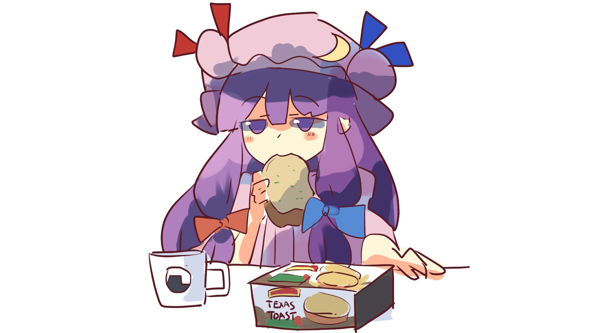 1girl blue_bow blue_ribbon blush bow bread bread_slice commentary crescent crescent_hat_ornament cup double-parted_bangs double_bun dress eating english_commentary english_text food food_in_mouth food_packaging hair_between_eyes hair_bun hand_on_table hat hat_ornament hat_ribbon highres holding holding_food jitome long_hair long_sidelocks low-tied_sidelocks mob_cap mouth_hold mug nagatsuki_kei_(nagatsuki22) patchouli_knowledge pink_hat pleated_dress purple_dress purple_eyes purple_hair red_bow red_ribbon ribbon shaded_face sidelocks simple_background solo table toast toast_in_mouth touhou upper_body very_long_hair white_background