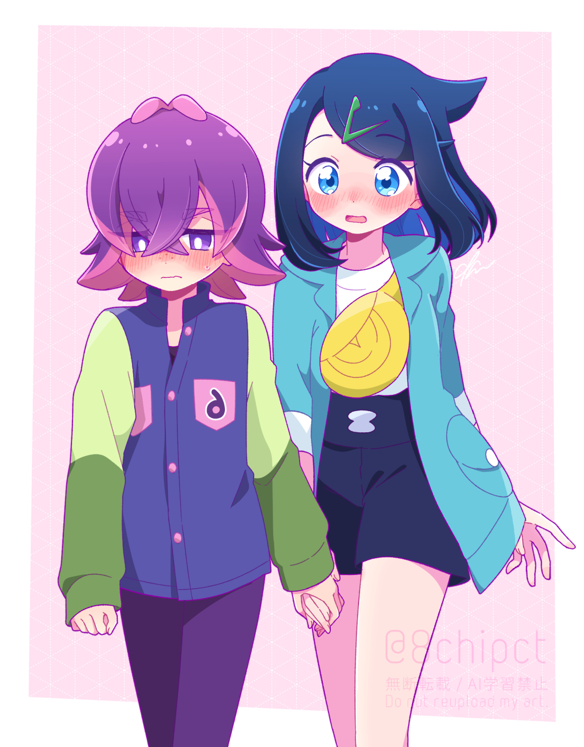 0zr8hc 2girls black_hair black_shorts blue_eyes blue_jacket blush closed_mouth colored_inner_hair crossed_bangs dot_(pokemon) hair_between_eyes hair_ornament hairclip highres holding_hands jacket liko_(pokemon) long_sleeves multicolored_hair multiple_girls nintendo open_clothes open_jacket open_mouth pants pink_hair pokemon pokemon_(anime) pokemon_horizons purple_eyes purple_hair purple_pants short_hair shorts two-tone_hair yuri
