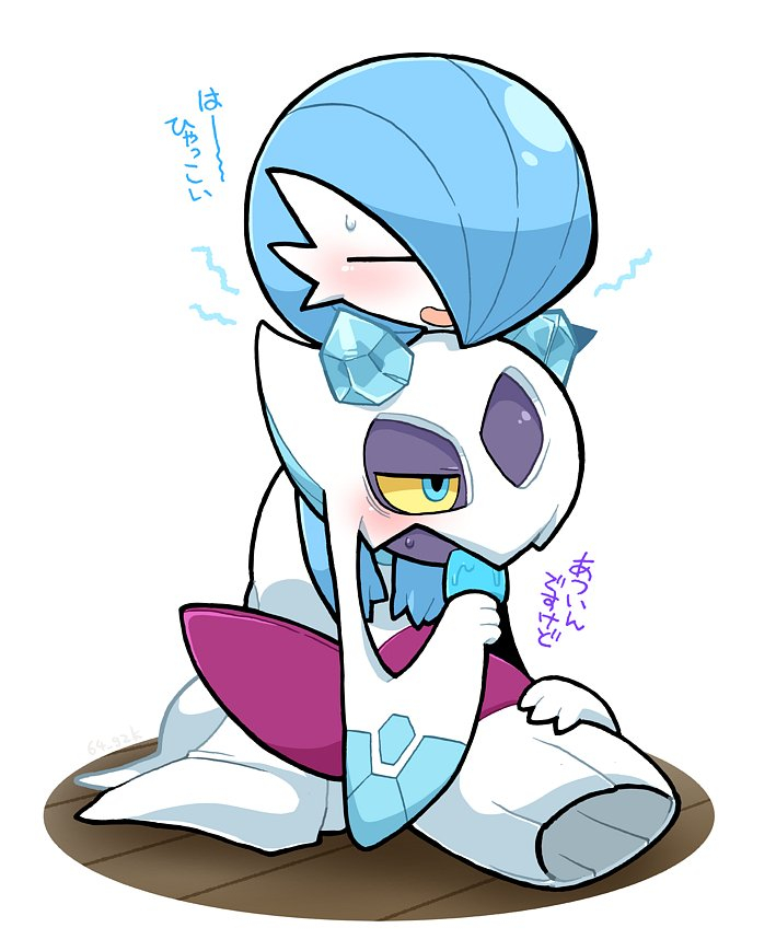 alternate_color blue_eyes blue_hair blue_skin bob_cut closed_eyes colored_sclera colored_skin food froslass gardevoir gen_3_pokemon gen_4_pokemon kageyama_(ikagerira) multicolored_skin nintendo pokemon pokemon_(creature) popsicle shiny_pokemon simple_background sweat two-tone_skin white_background white_skin yellow_sclera
