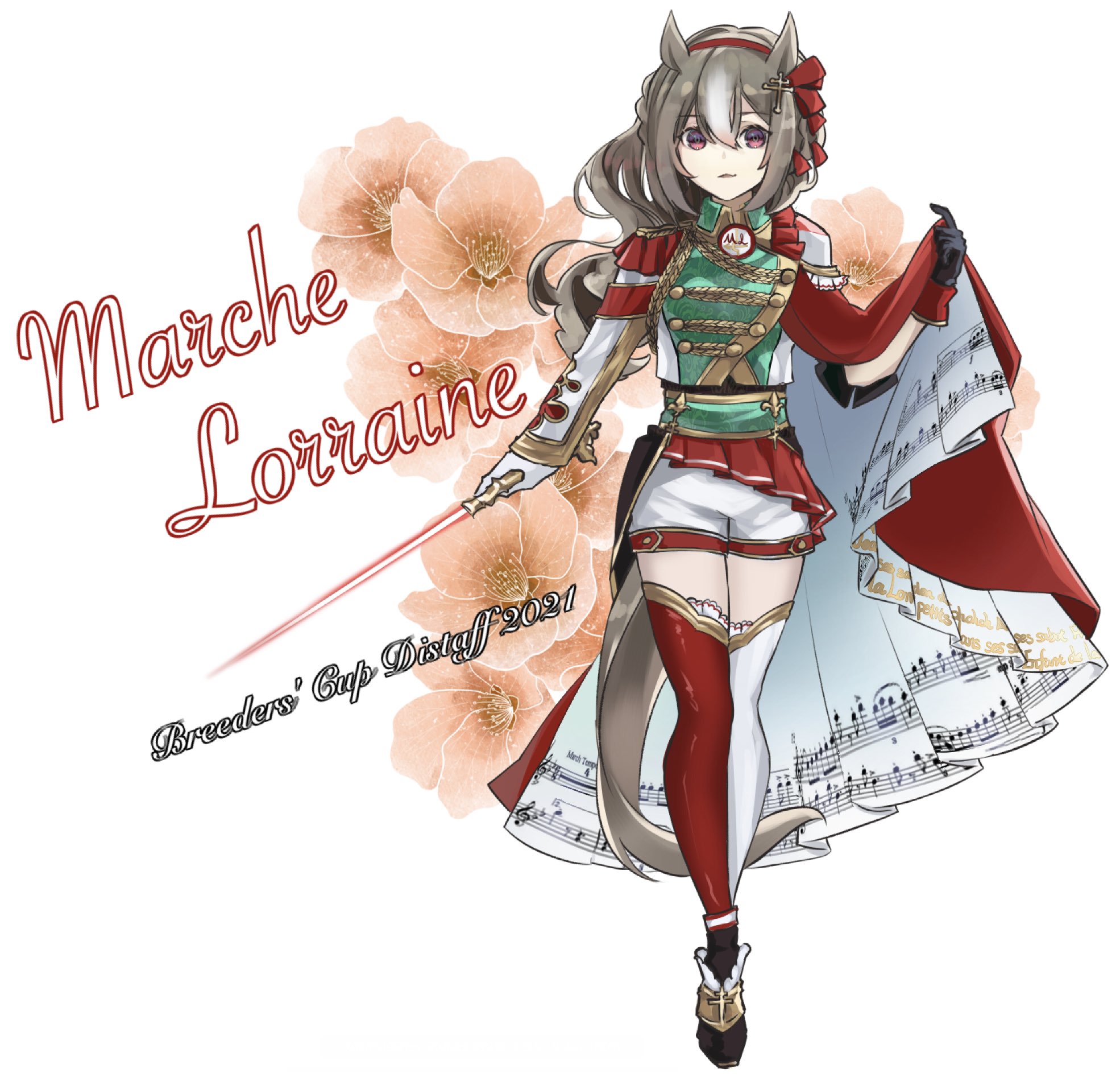 1girl asymmetrical_gloves asymmetrical_legwear bad_id bad_twitter_id black_gloves character_name cursive ear_ornament epaulettes full_body gassan_aya gloves gradient_hair hairband highres long_hair marche_lorraine_(racehorse) mismatched_gloves mismatched_legwear multicolored_hair musical_note original personification red_eyes red_hairband red_thighhighs shorts single_epaulette solo streaked_hair thighhighs third-party_source umamusume white_gloves white_shorts white_thighhighs