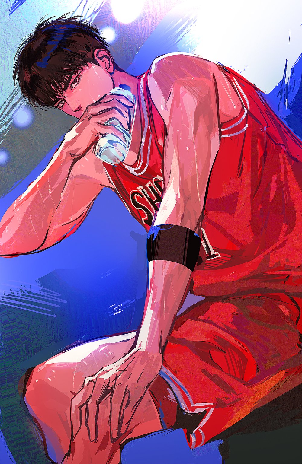 1boy arm_up armband bare_shoulders basketball basketball_jersey basketball_shorts basketball_uniform black_hair bottle commentary_request covering_own_mouth feet_out_of_frame hand_on_own_knee highres holding holding_bottle korean_commentary looking_ahead male_focus playing_sports puppy_1ove red_shorts rukawa_kaede scoop_neck short_hair shorts sitting slam_dunk_(series) sleeveless solo sportswear sweat very_sweaty water_bottle