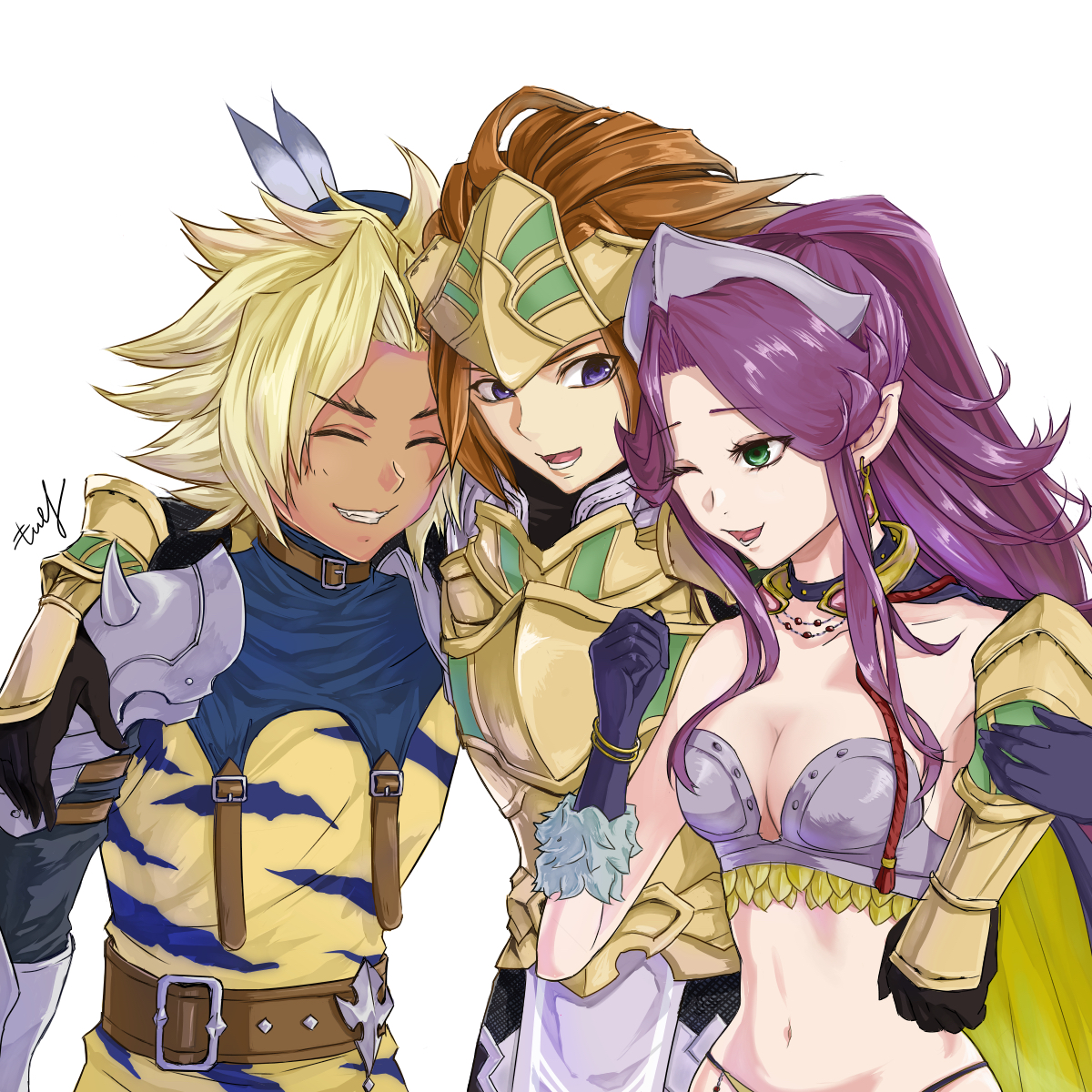 1girl 2boys angela_(seiken_densetsu_3) armor bikini_armor black_gloves blonde_hair blue_eyes breasts brown_hair cape cleavage closed_eyes duran_(seiken_densetsu_3) fatal_fist fur_trim gloves green_cape green_eyes hair_intakes hand_on_another's_shoulder headgear highres holding holding_staff kevin_(seiken_densetsu_3) liege long_hair magus_(seiken_densetsu_3) medium_breasts multiple_boys navel official_alternate_costume one_eye_closed open_mouth parted_bangs pointy_ears purple_hair revealing_clothes seiken_densetsu seiken_densetsu_3 sidelocks smile square_enix staff swept_bangs teeth thong tiara wide_hips